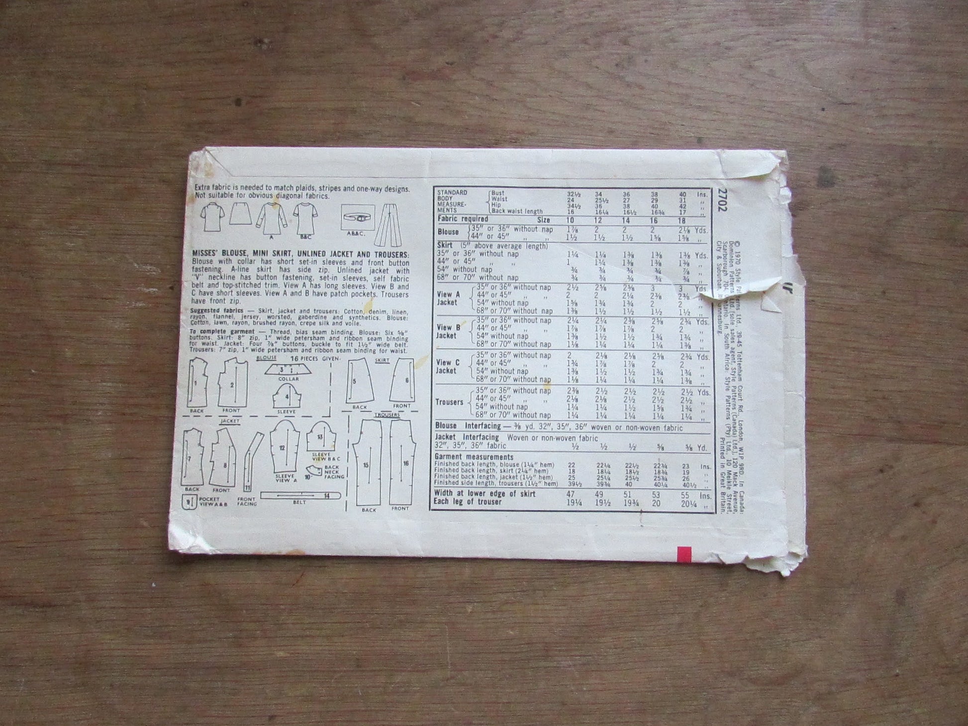 Part cut 1970 Style 2702 sewing pattern for misses' blouse, unlined jacket & trousers, size 14 (see description below)
