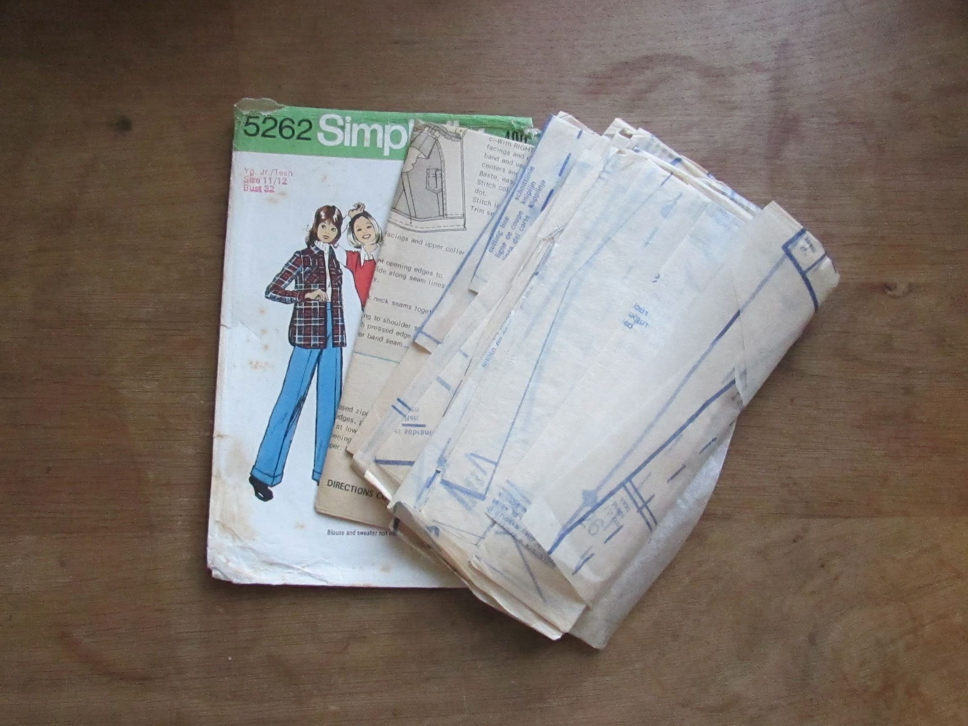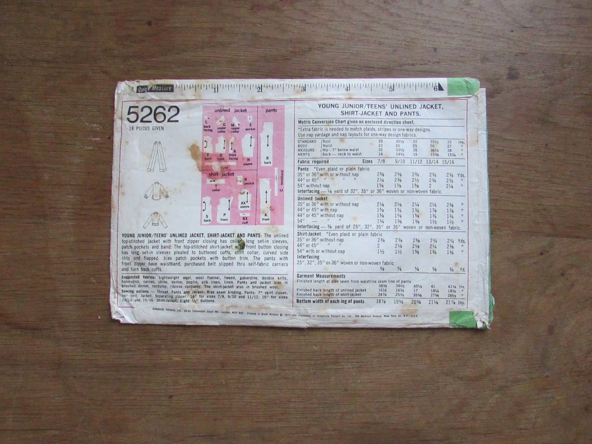 Part cut 1972 Simplicity 5262 sewing pattern for young junior/teens' unlined jacket, shirt-jacket & pants, size 11/12 (complete)