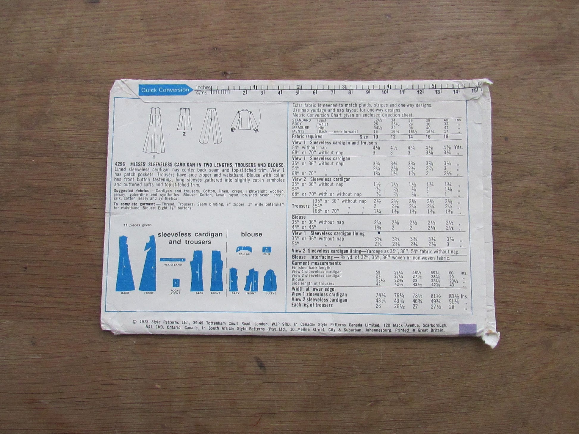 Part cut 1973 Style 4296 sewing pattern for misses' sleeveless cardigan, trousers & blouse, size 10 (complete)