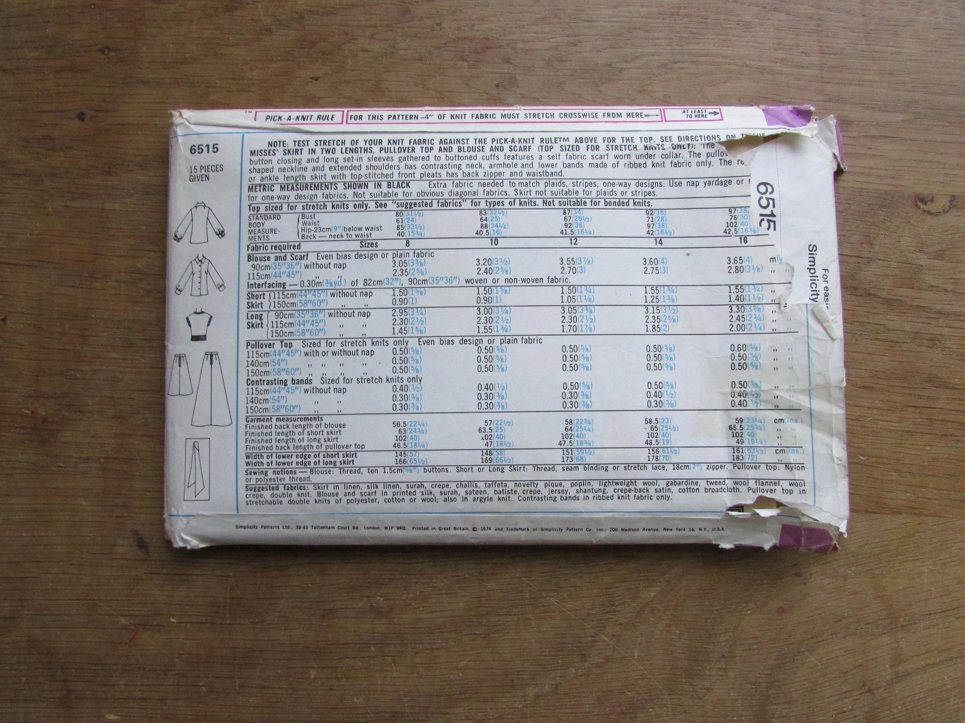 Part cut 1974 Simplicity 6515 sewing pattern for misses' skirt, pullover top, blouse & scarf, size 10 (see description below)