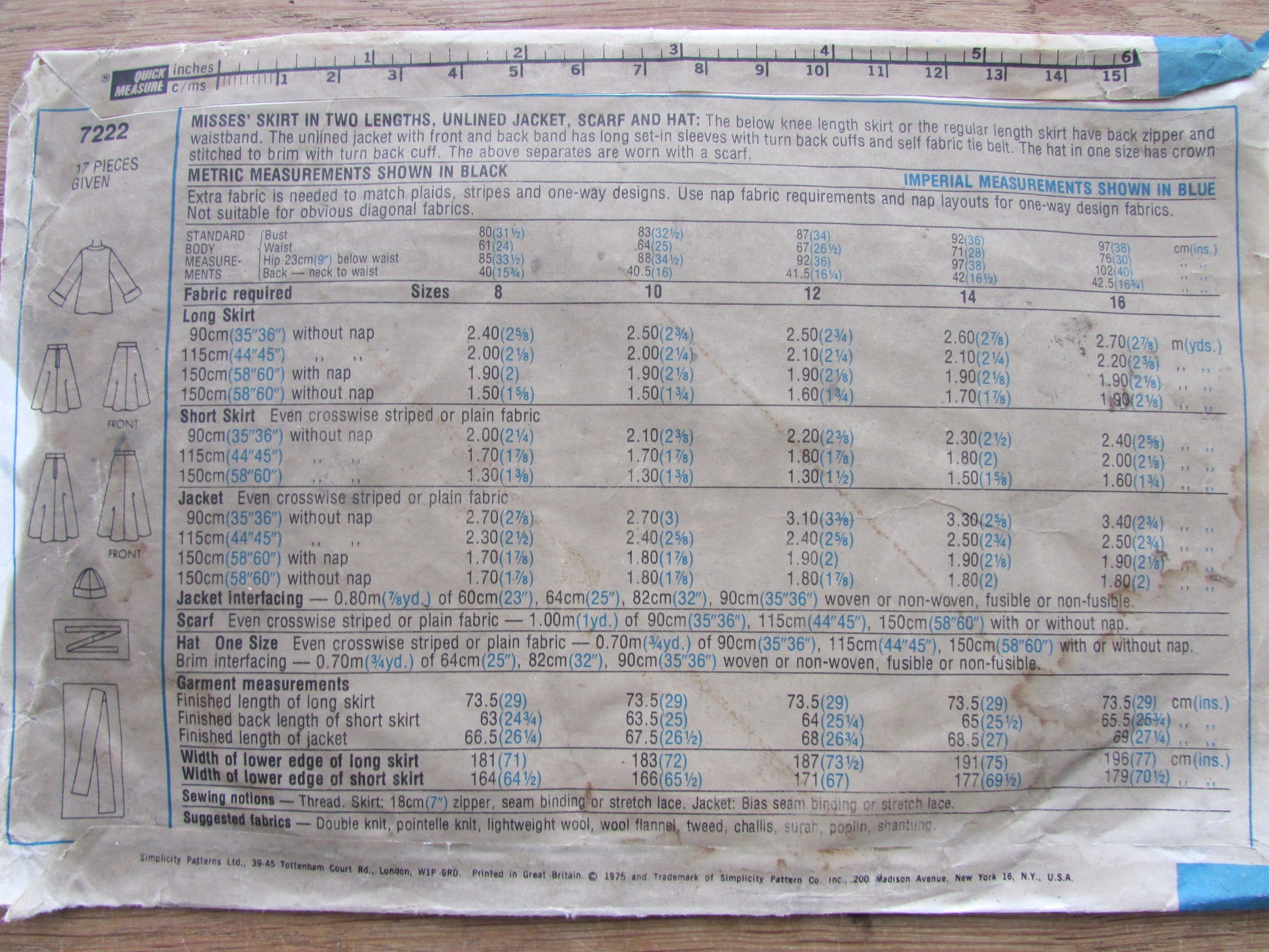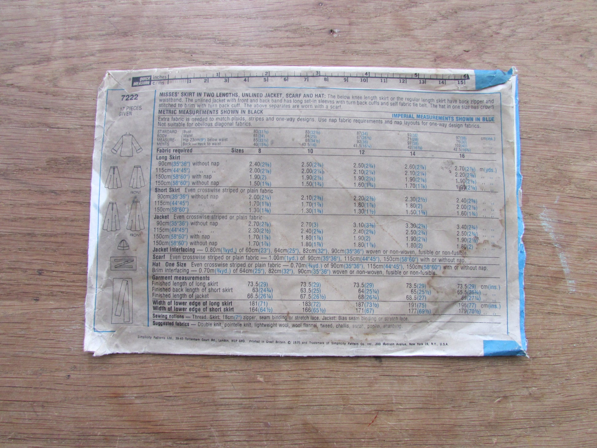 Part cut 1975 Simplicity 7222 sewing pattern for misses' skirt, unlined jacket & scarf, size 10 (complete)