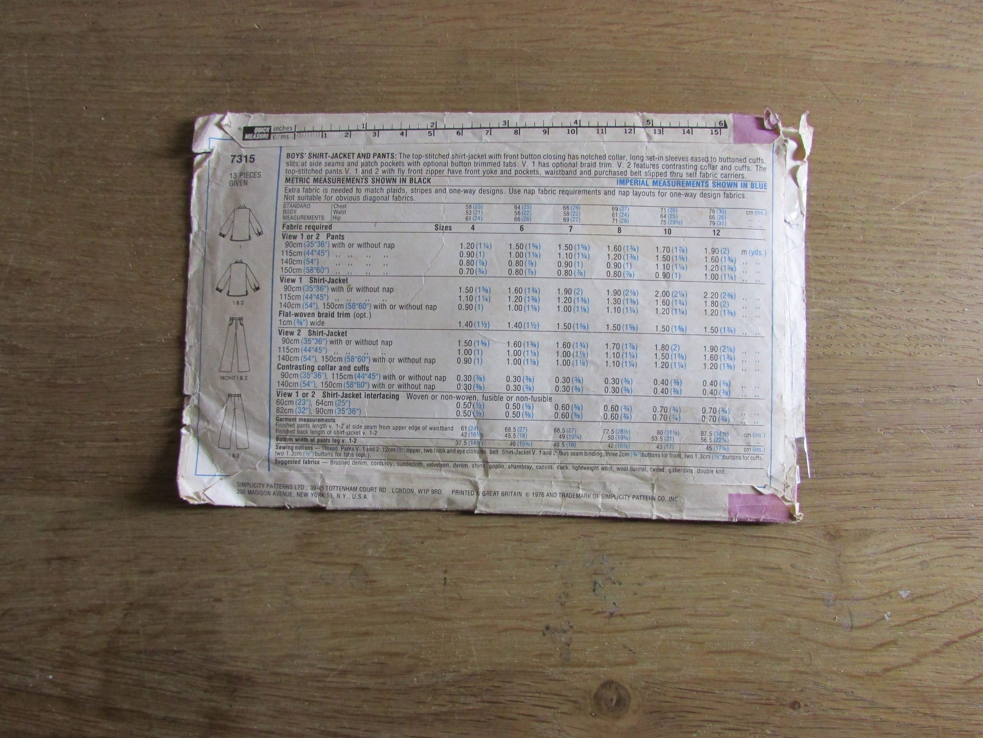 Part cut 1976 Simplicity 7315 sewing pattern for boy's shirt, jacket & pants, sizes 7 + 8 (complete, see description below)