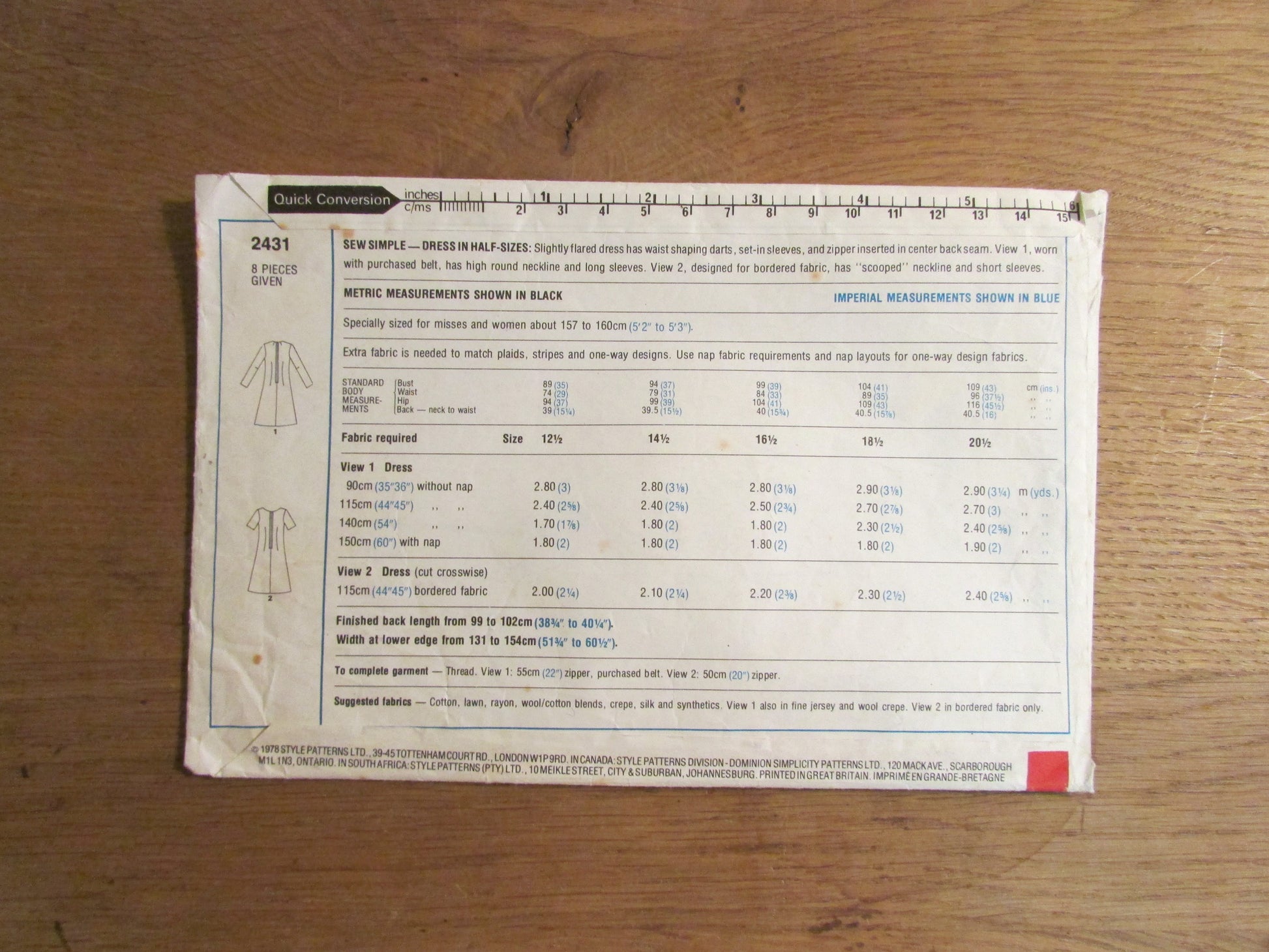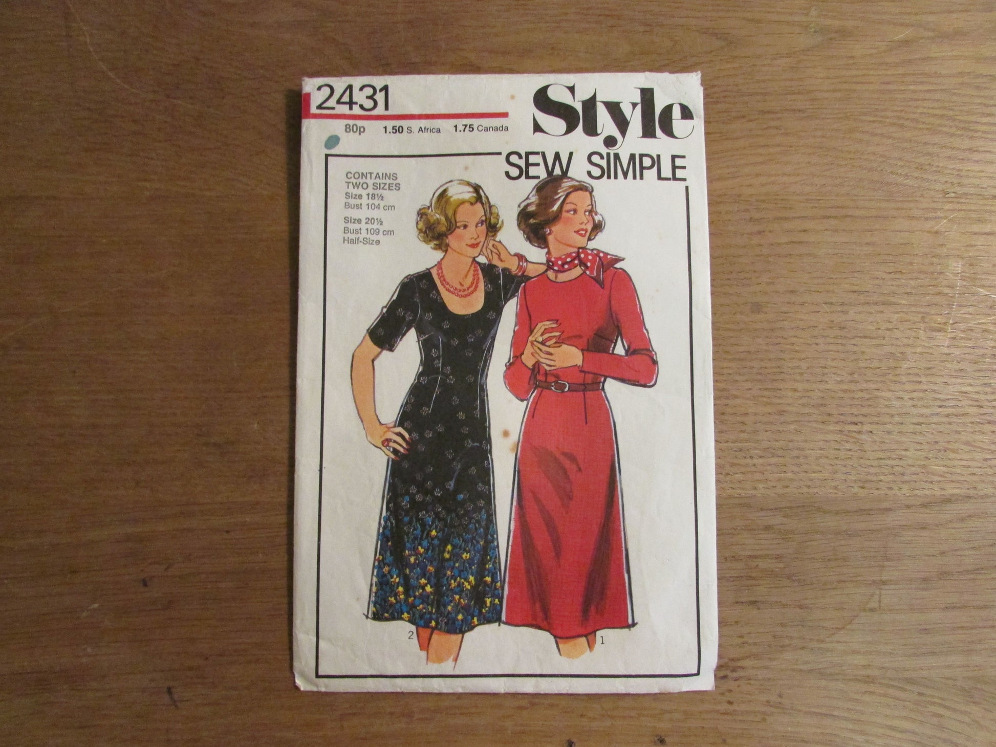 Part cut 1978 Style 2431 sewing pattern for dresses in half-sizes, sizes 18.5 + 20.5 (crudely cut to size 20.5, complete)