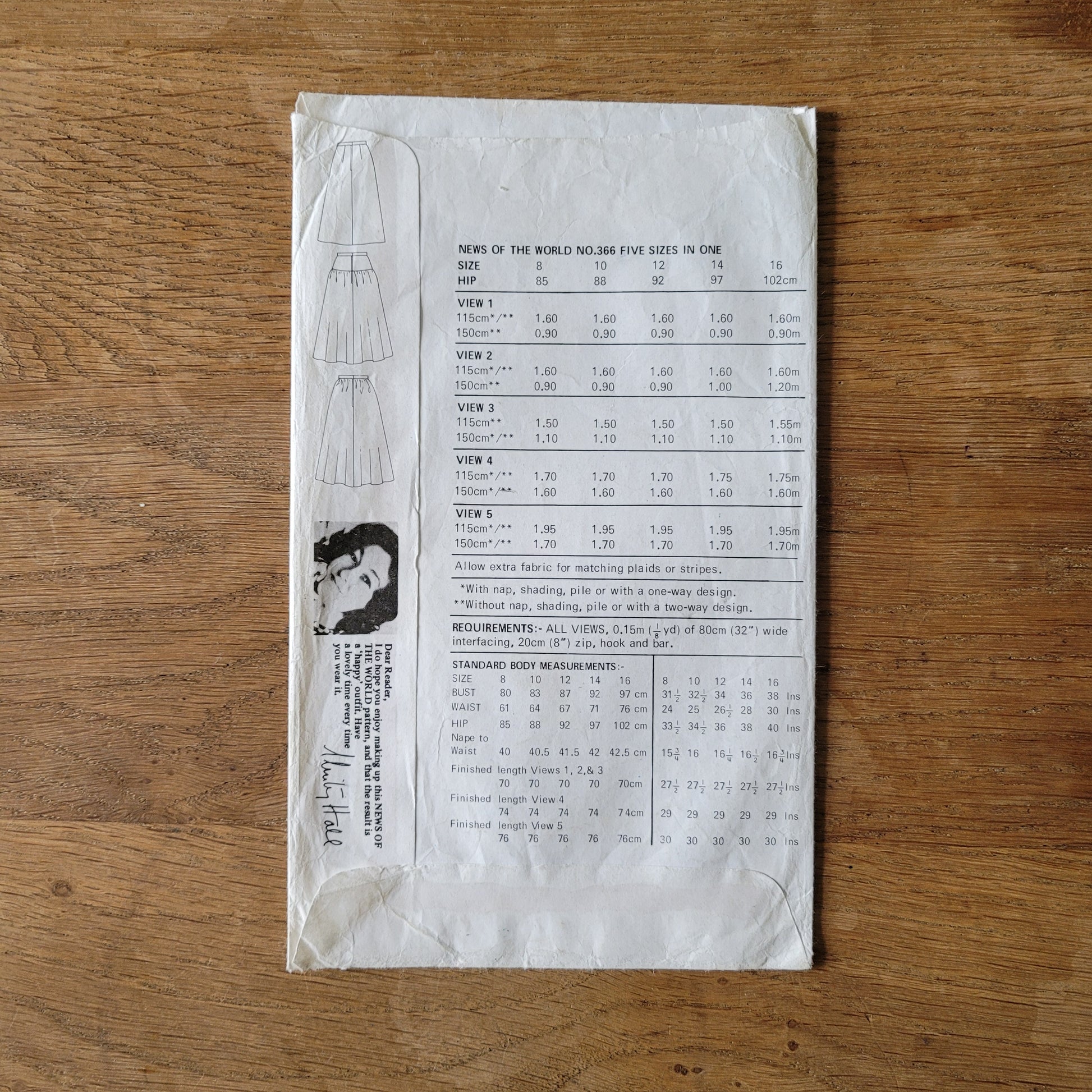 Part cut 1980s News of the World No.366 sewing pattern for skirts in three variations, sizes 8 to 16 (complete, but see description below)