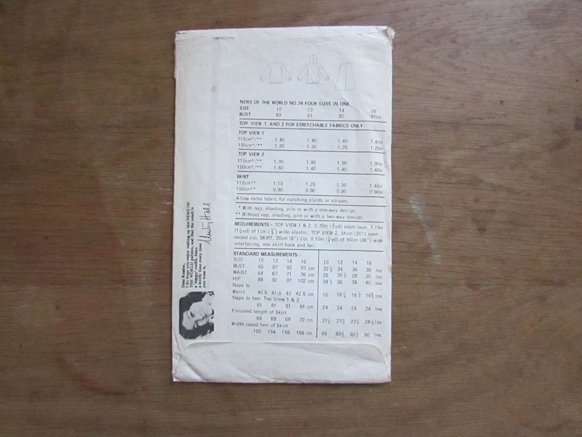 Part cut 1980s News of The World No.74 sewing pattern for top with or without hood, & skirt, sizes 10 to 16 (cut to size 16, complete)