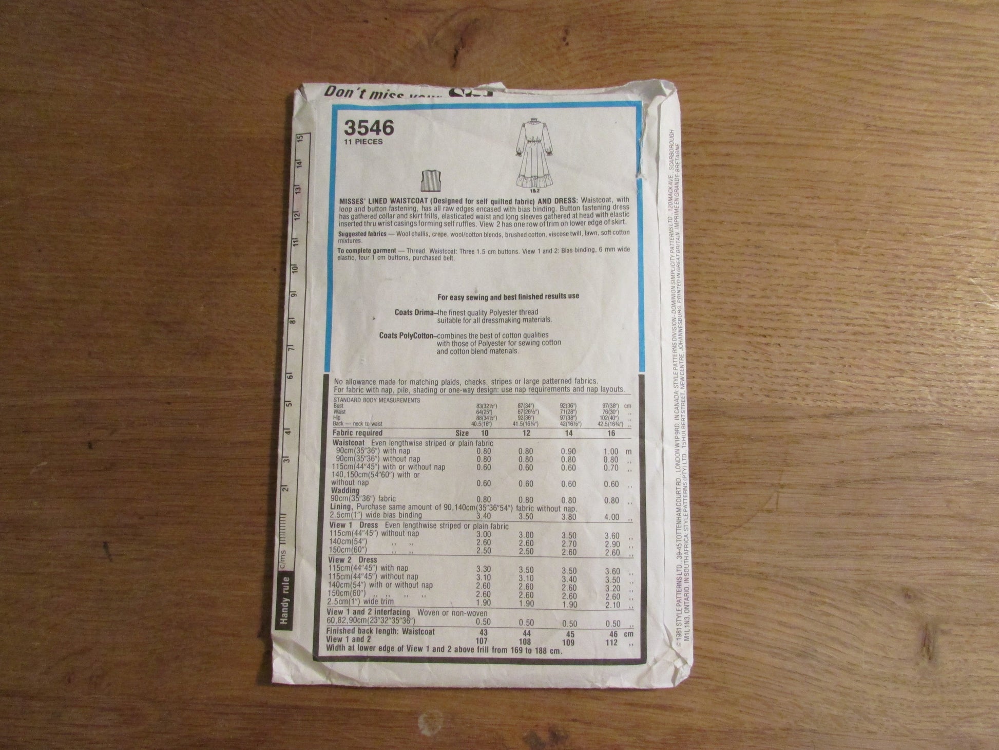 Part cut 1981 Style 3546 sewing pattern for misses' lined waistcoat & dress, size 10 (complete)