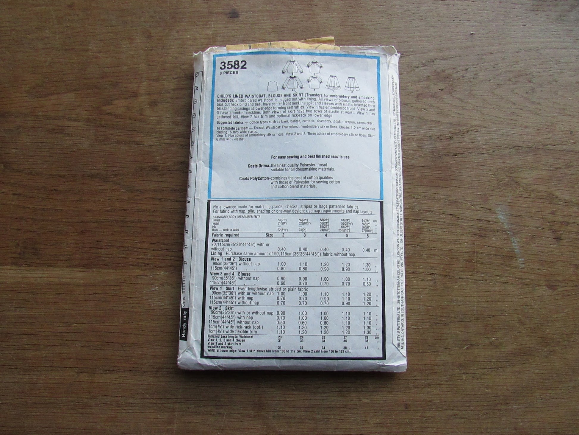 Part cut 1981 Style 3582 sewing pattern for child's lined waistcoat, blouse & skirt, size 2 (complete but see description below)