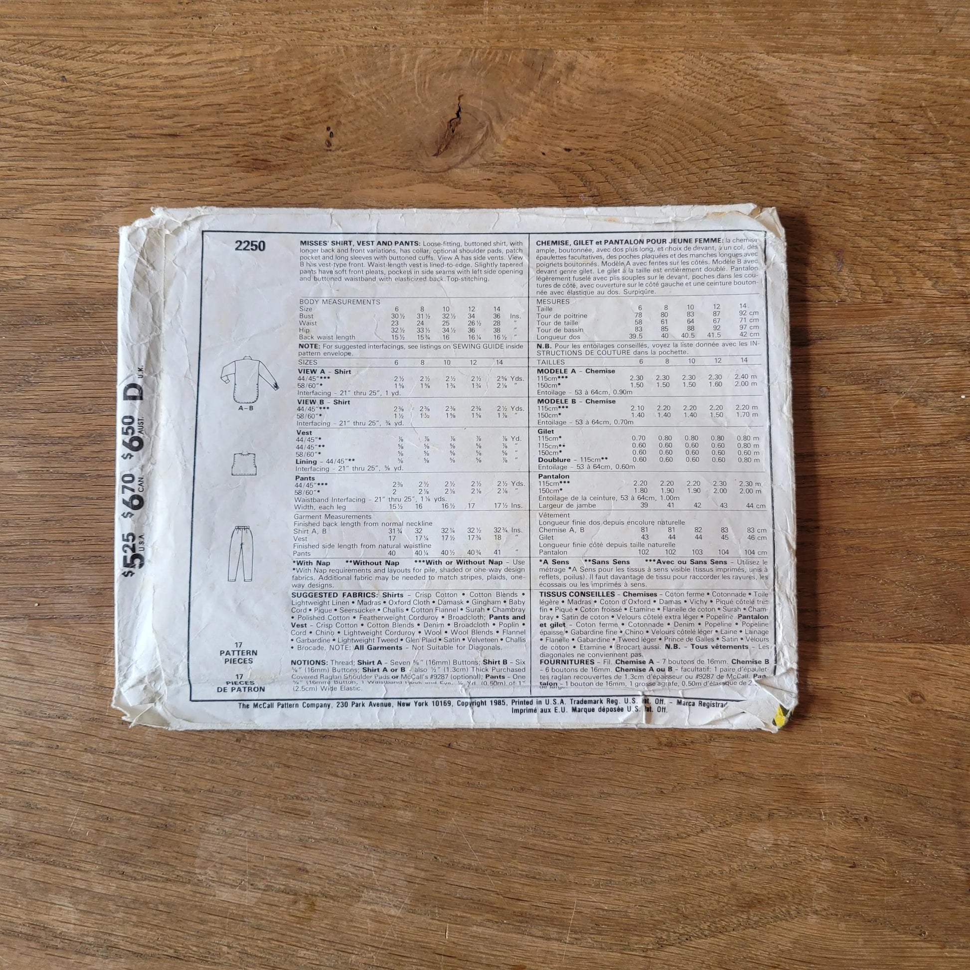 Part cut 1985 McCall's 2250 sewing pattern for misses' shirt, vest & pants, size 14 (*see description below)