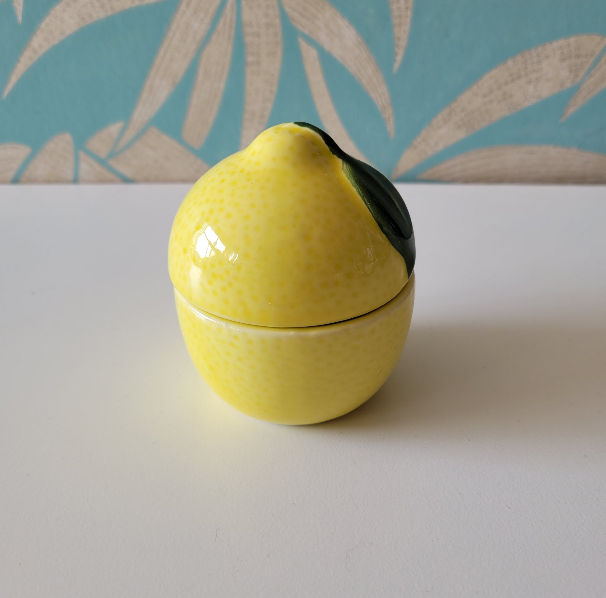 Squeeze some vintage charm into your kitchen with this delightful ceramic lemon preserve pot! Standing at a cheerful 9cm tall with a sturdy 4cm base, it's the perfect pint-sized companion for your favourite jams, marmalades, or sweet treats. Crafted with retro flair, this zesty little number brings a burst of colour and personality to any shelf or table.