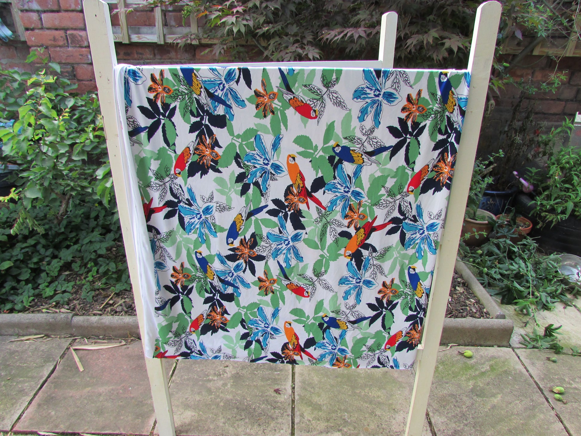 Retro tropical parrot & hibiscus stretchy dress fabric piece, 86" x 64"
