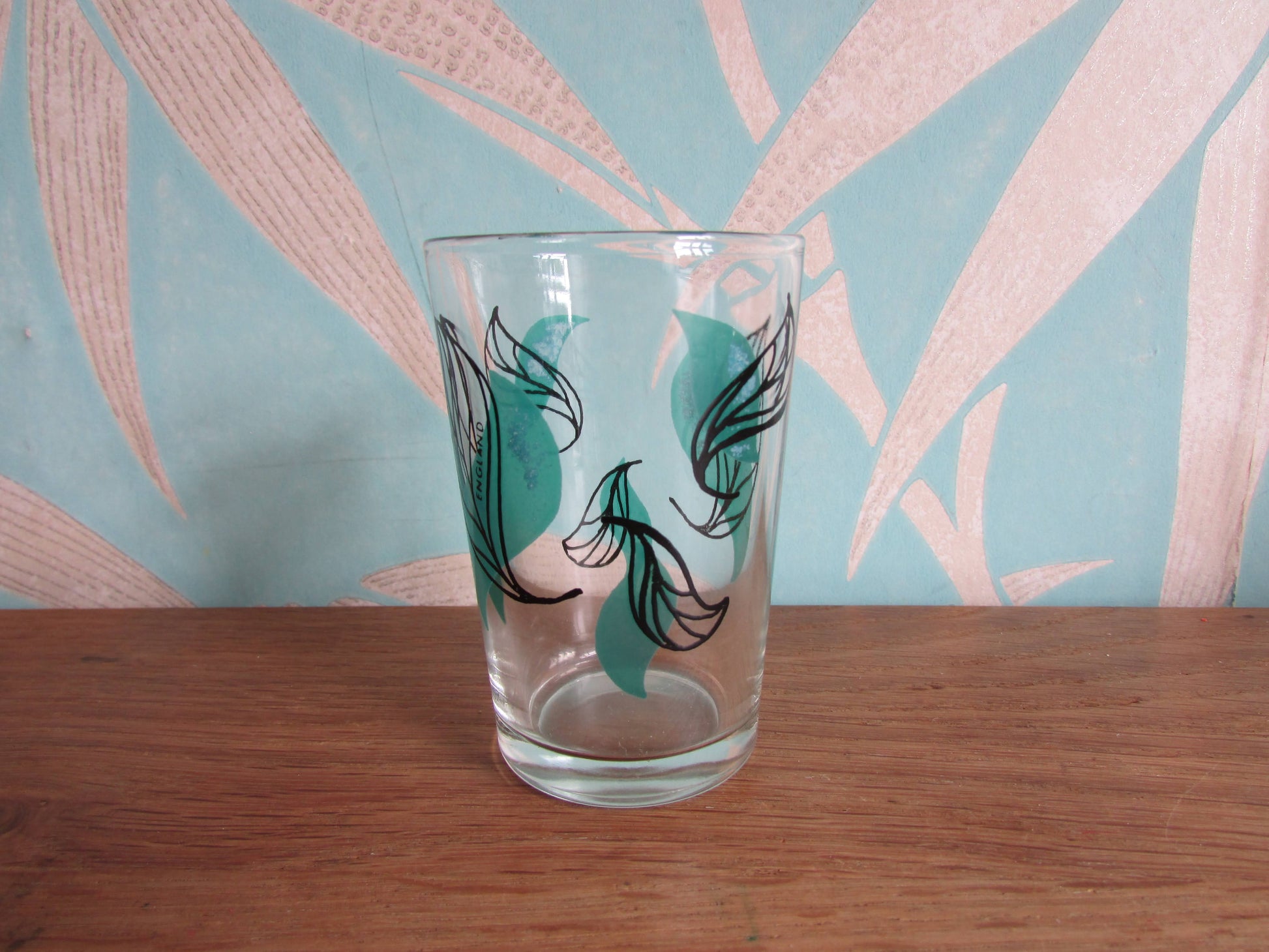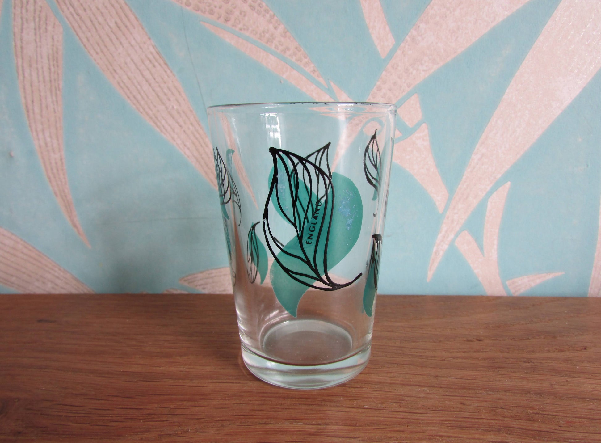 This charming set of six 1950s shot glasses features a distinctive green and black leaf pattern, expertly crafted in England. Perfect for adding vintage character to your home bar or as a unique collectible, these glasses blend mid-century style with everyday practicality. Elevate your drinking experience or impress guests with this timeless conversation piece.