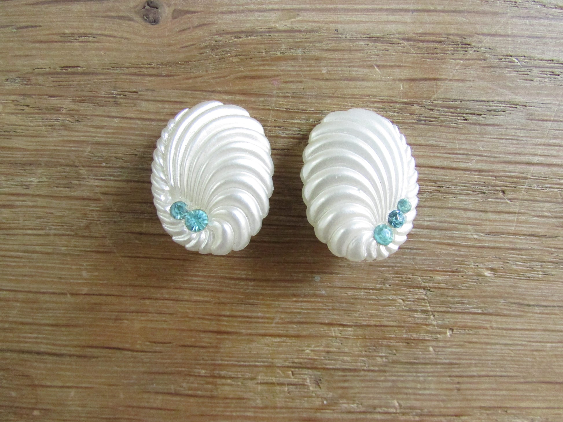 Small vintage white plastic scallop ribbed clip-on earrings with diamante detail