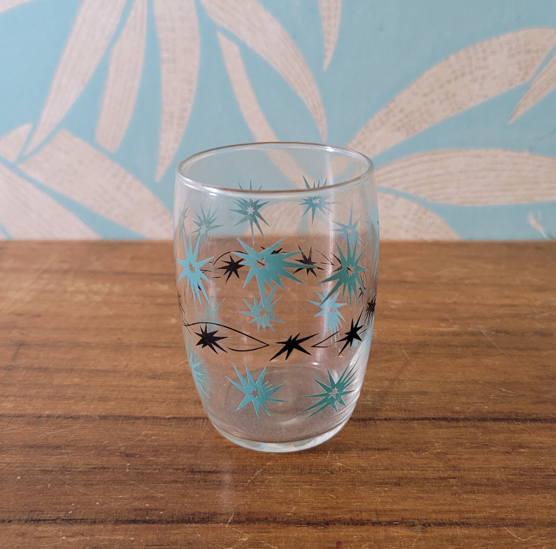 These vintage juice glasses, each standing 8cm tall, feature striking atomic starburst patterns in yellow and black, and turquoise and black. Representing the bold mid-century modern style of the 1950s and 60s, their vivid colors and unique designs make them perfect for collectors and a standout addition to any retro-themed table. Designed to celebrate the era’s optimistic spirit, they combine nostalgic charm with practical functionality for serving juice.