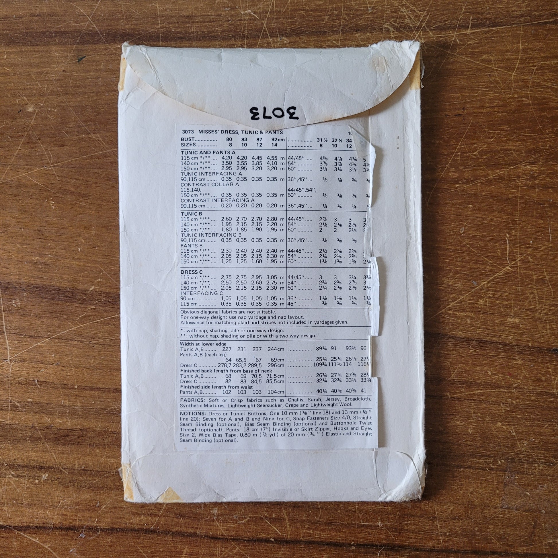 Uncut 1973 Butterick 3073 sewing pattern for misses' dress, tunic & pants, size 12 (complete)