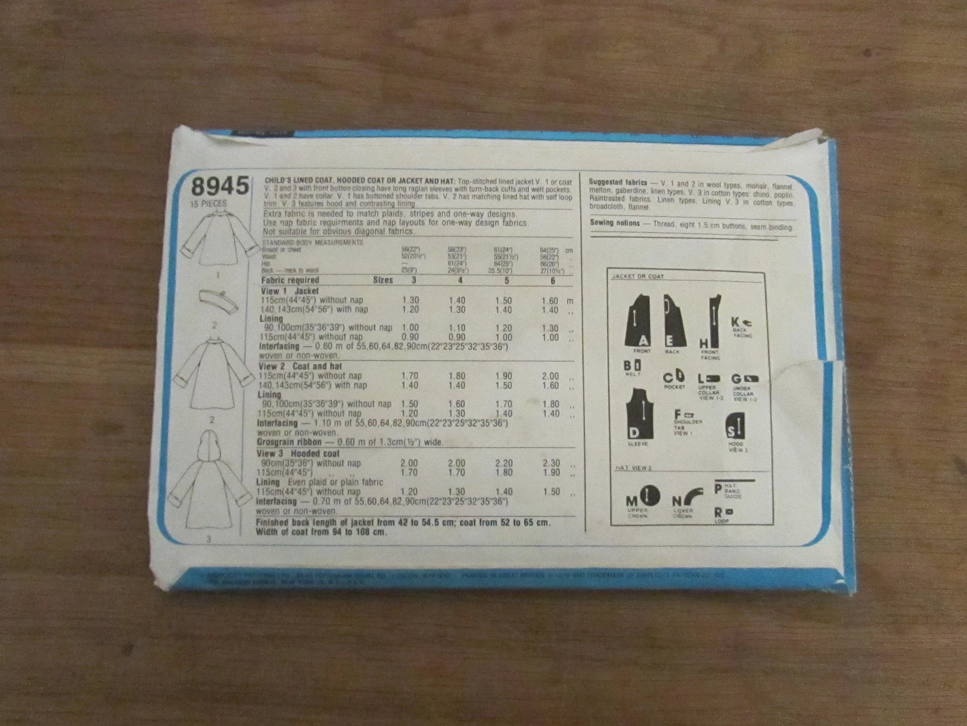 Uncut 1979 Simplicity 8945 sewing pattern for child's lined coat, hooded coat or jacket & hat, size 6 (complete)