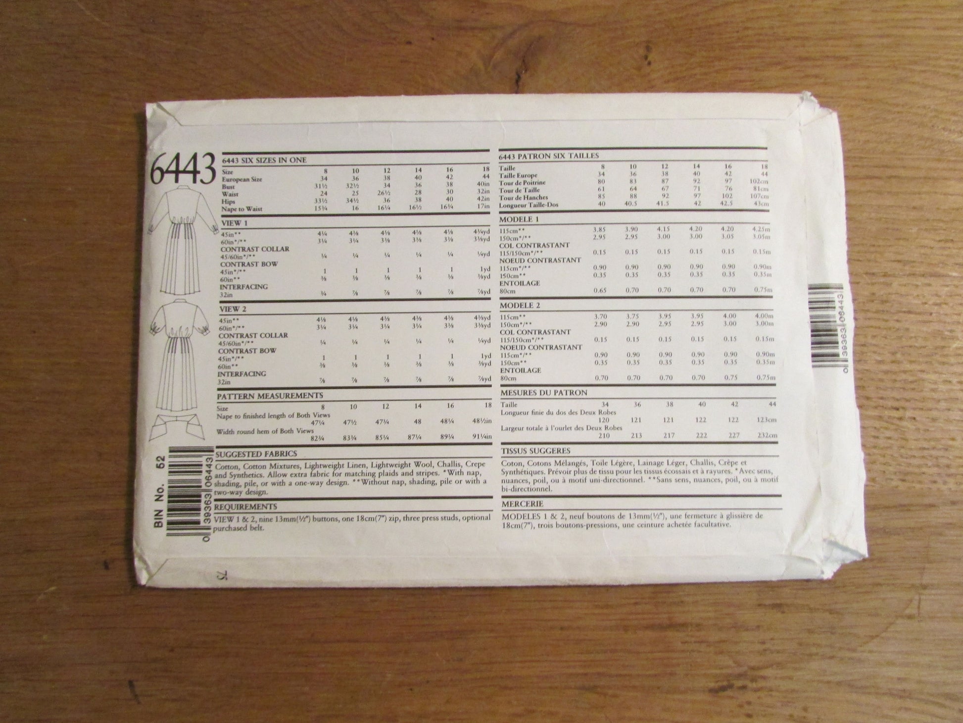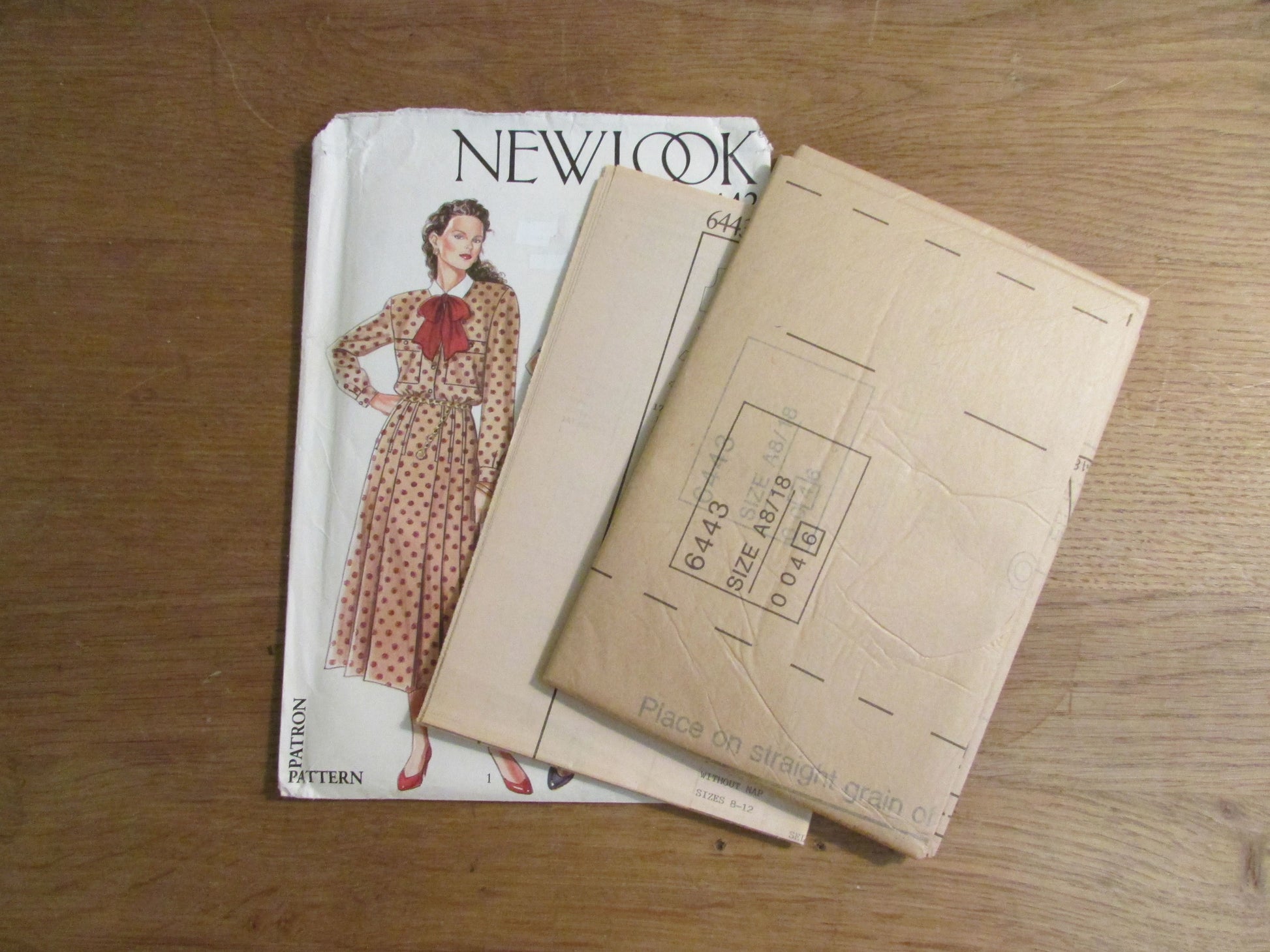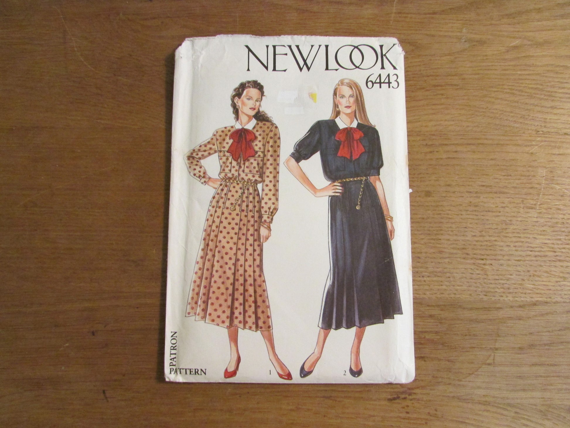Uncut 1980s New Look 6443 sewing pattern for dress with bow, sizes 8-18 (complete)