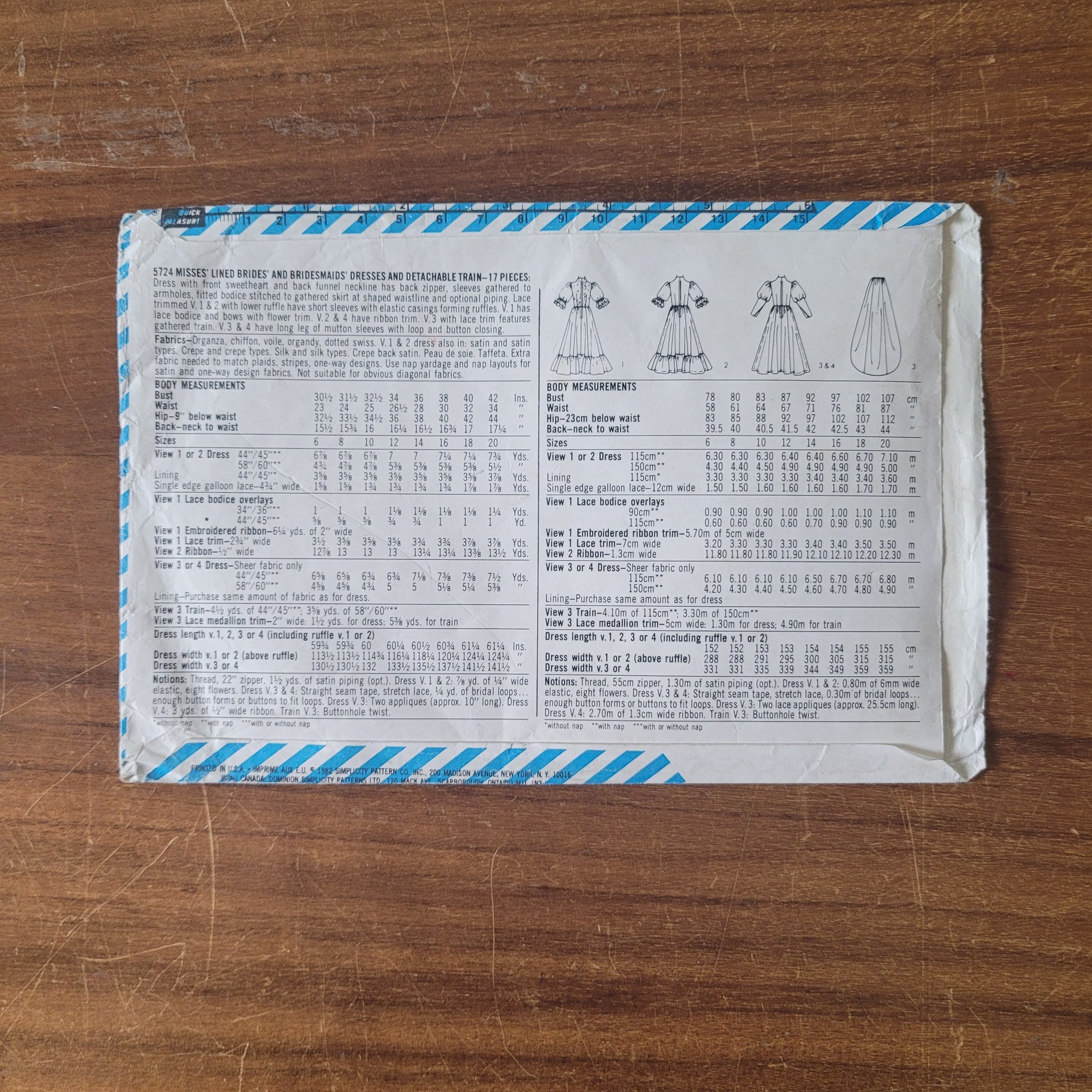 Uncut 1982 Simplicity 5724 sewing pattern for misses' lined brides' & bridesmaids' dresses, and detachable train, sizes 6 + 8 (complete)