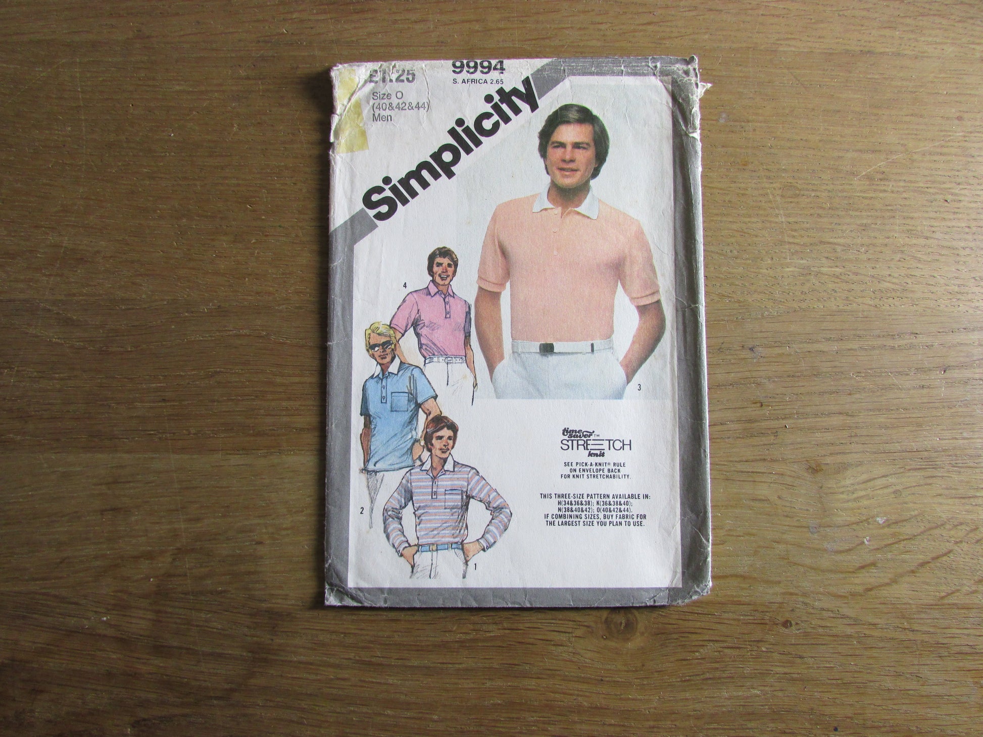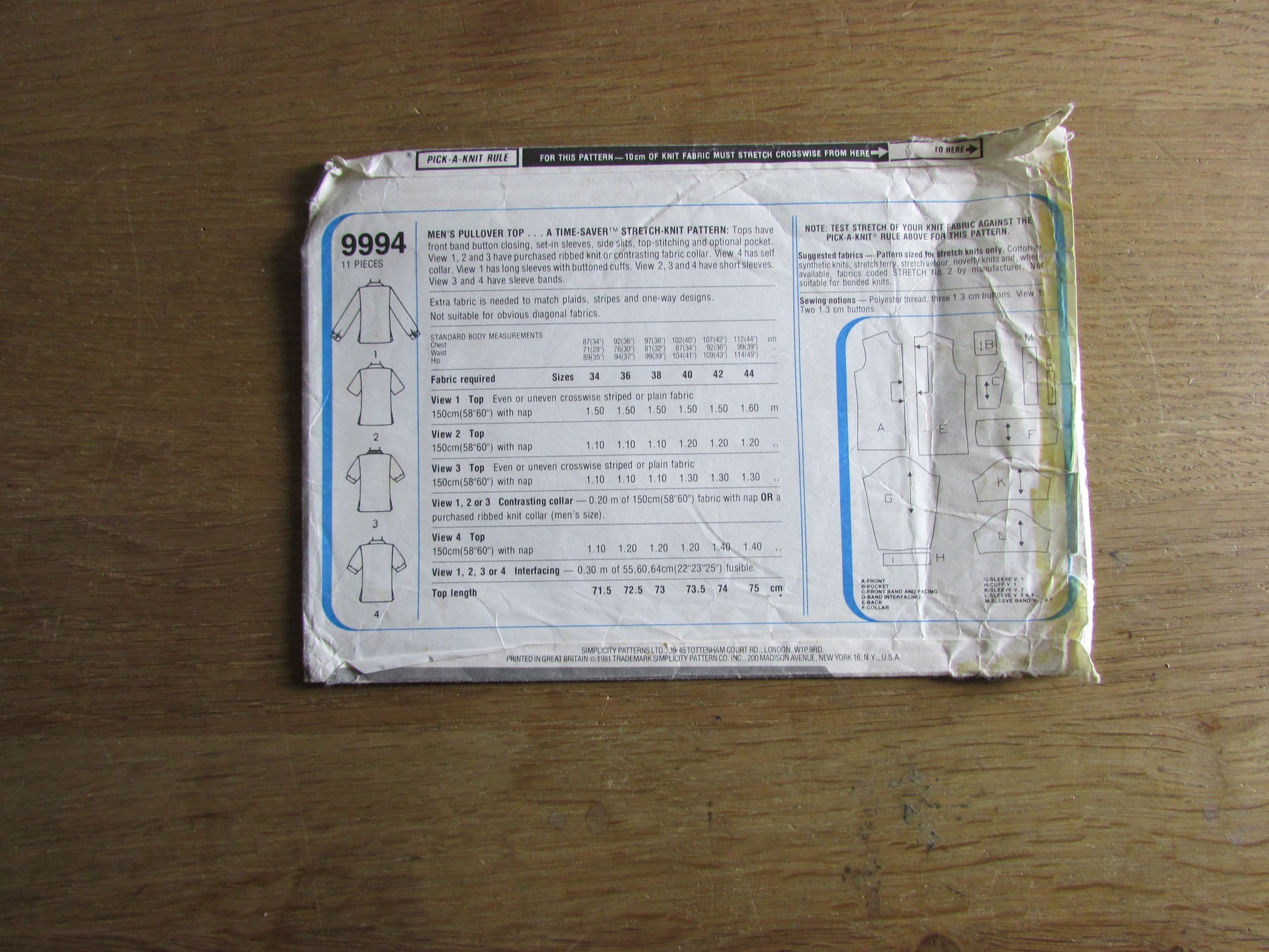 Uncut 1984 Simplicity 9994 sewing pattern for men's pullover top, size L (complete)