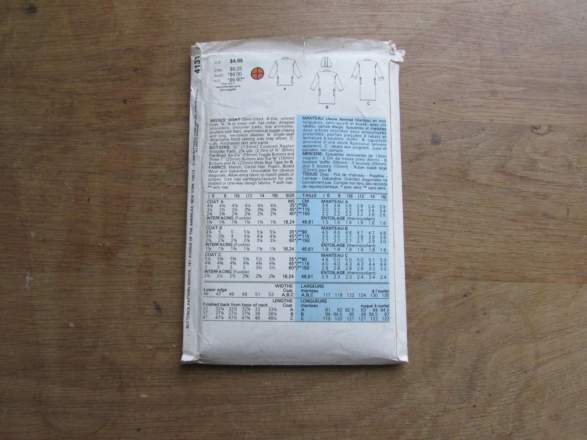 Uncut 1986 Butterick 4131 sewing pattern for misses' coat, sizes 12-16 (complete)