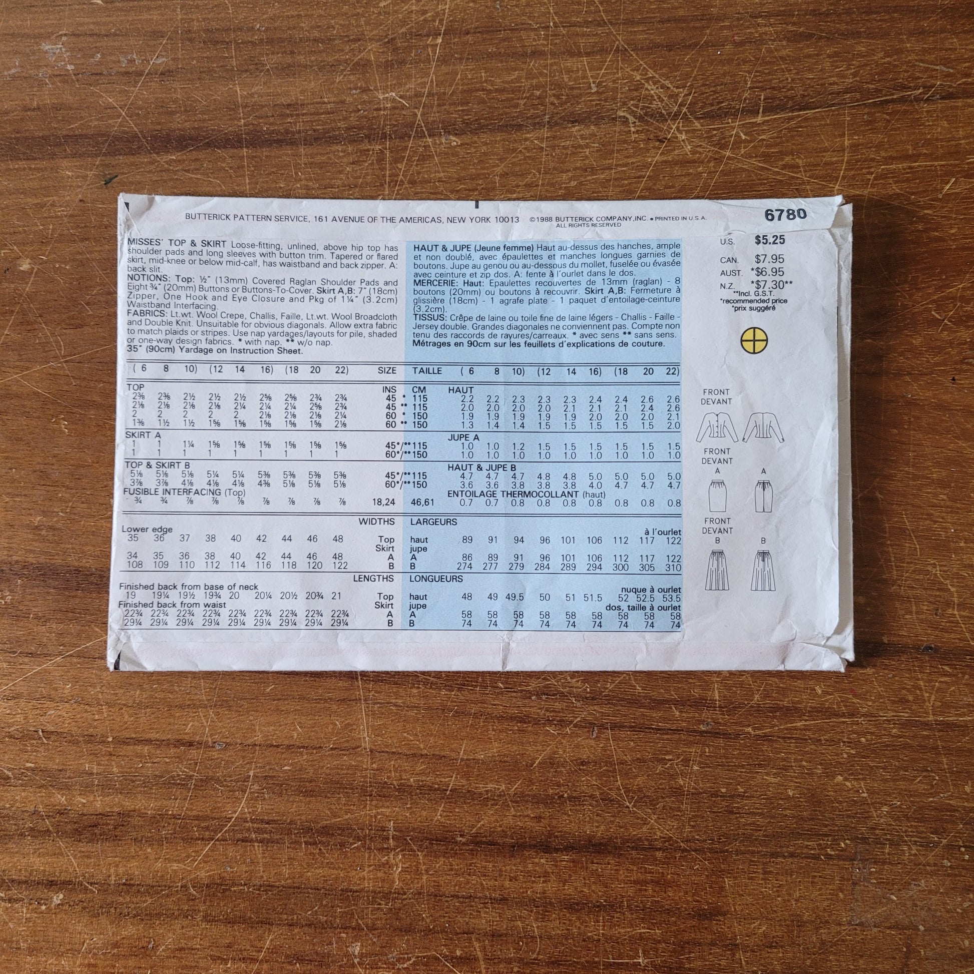 Uncut 1988 Butterick 6780 sewing pattern for misses' top & skirt, sizes 12-16 (see description below)