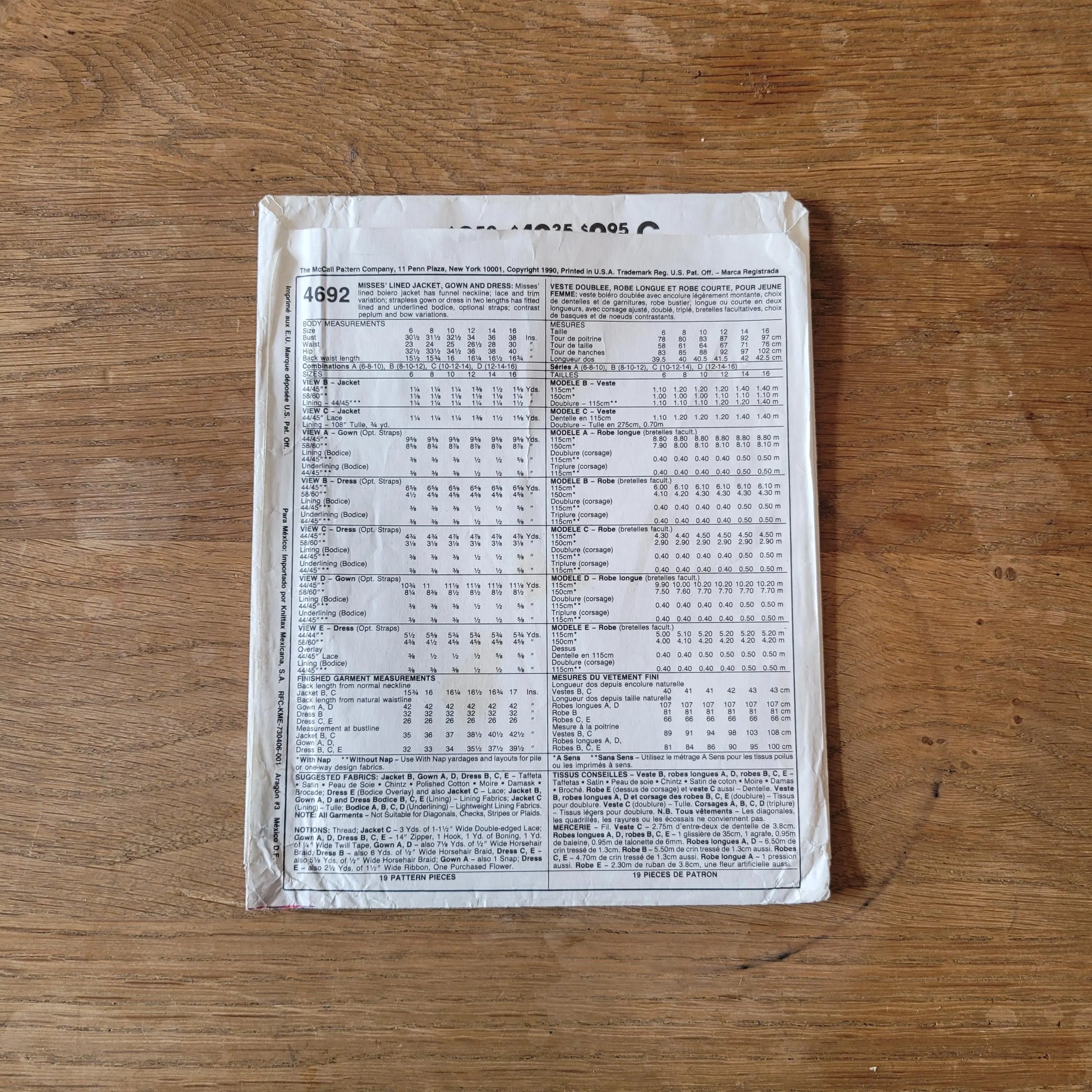 Uncut 1990 McCall's 4692 sewing pattern for misses' lined jacket, gown & dress, sizes 12 to 16 (complete, *see description below)