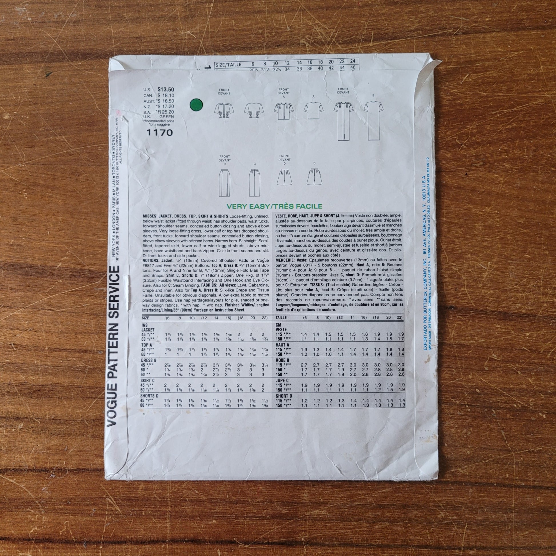Uncut 1993 Vogue 1170 sewing pattern for misses' jacket, dress, top, skirt & shorts, sizes 12-16 (complete)