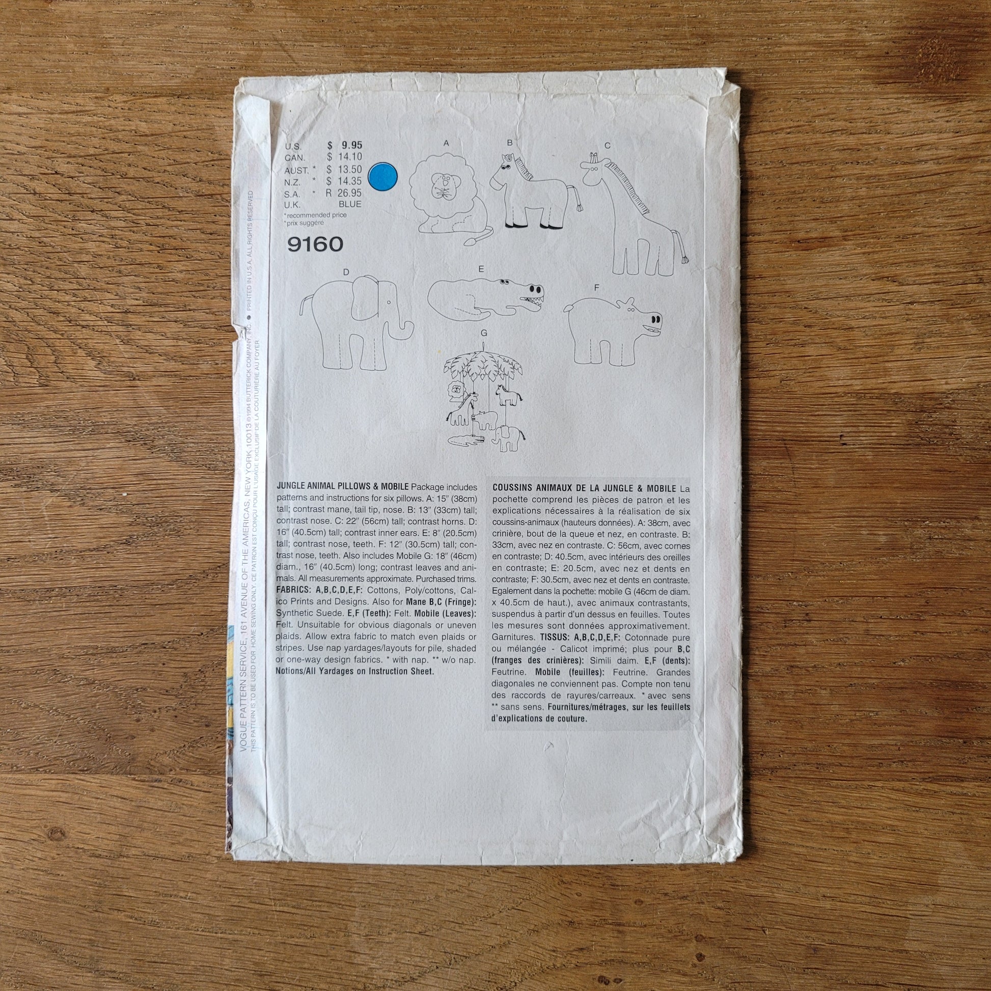 Uncut 1994 Vogue Craft 9160 sewing pattern for jungle animal pillows & mobile (complete)