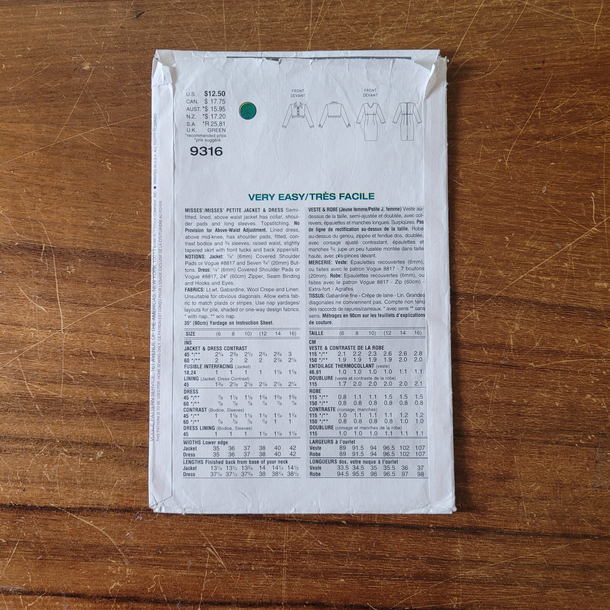 Uncut 1995 Vogue 9316 sewing pattern for misses'/misses' petite jacket & dress, sizes 12 to 14 (complete)