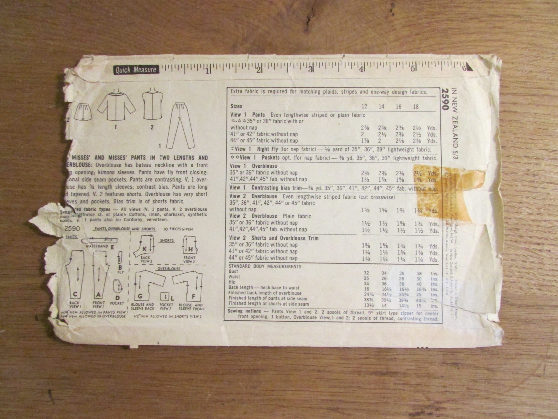 Used 1958 Simplicity 2590 sewing pattern for misses' & misses' pants in two lengths, and overblouse, size 14 (complete)