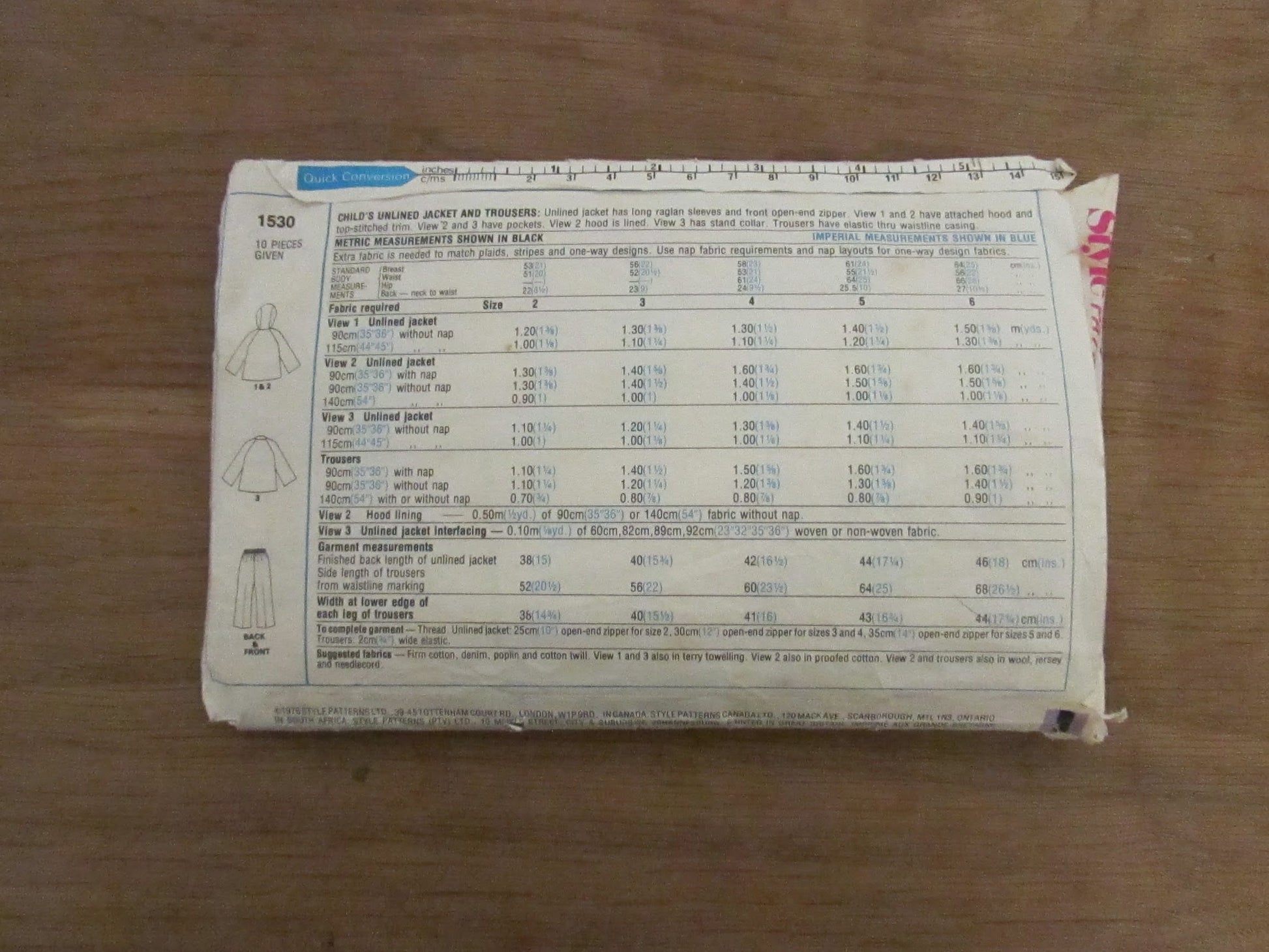 Used 1972 Style 1530 sewing pattern for child's unlined jacket & trousers, size 2 (complete)