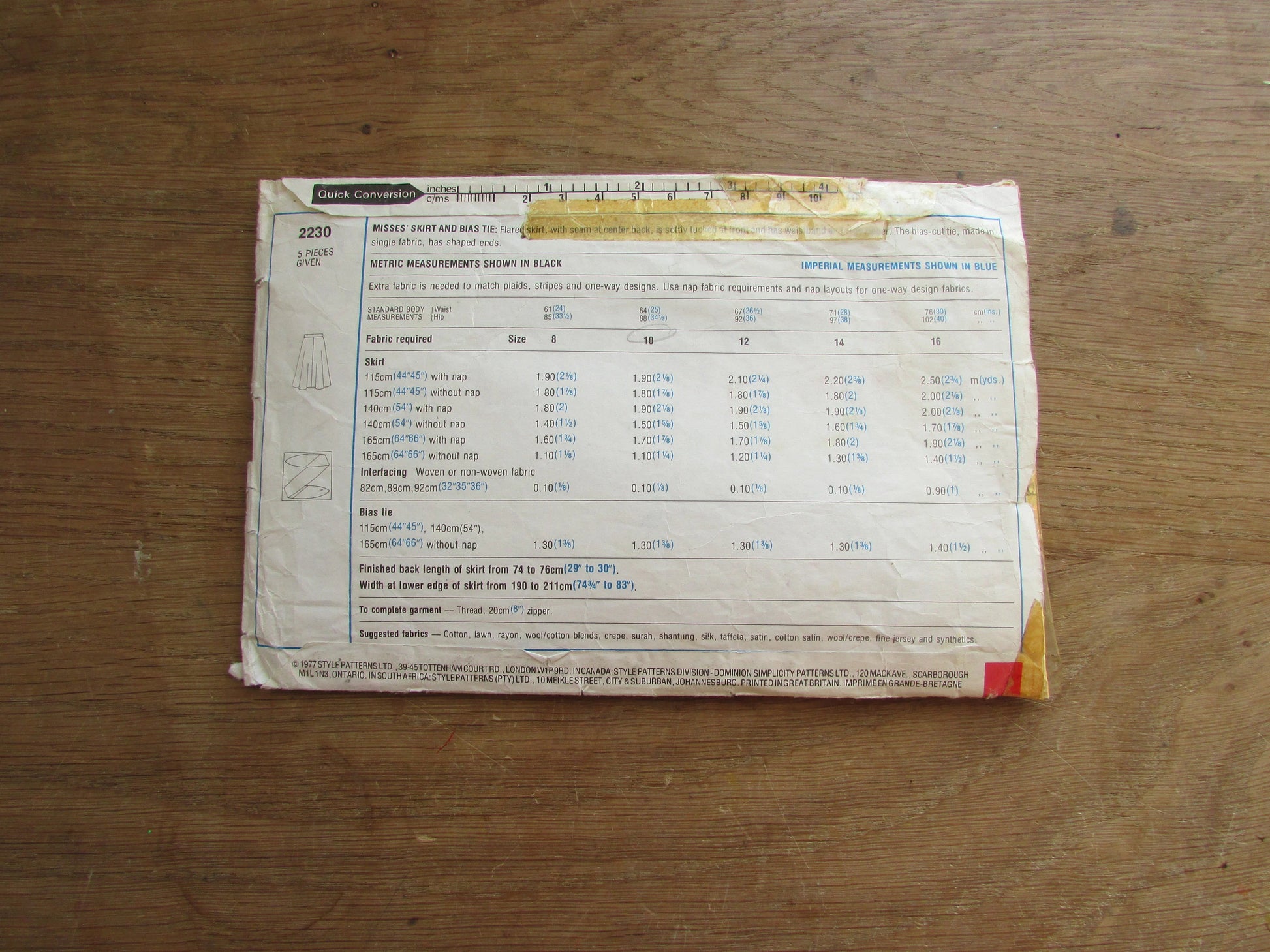 Used 1977 Style 2230 sewing pattern for misses' skirt & bias tie, size 10 (see description below)