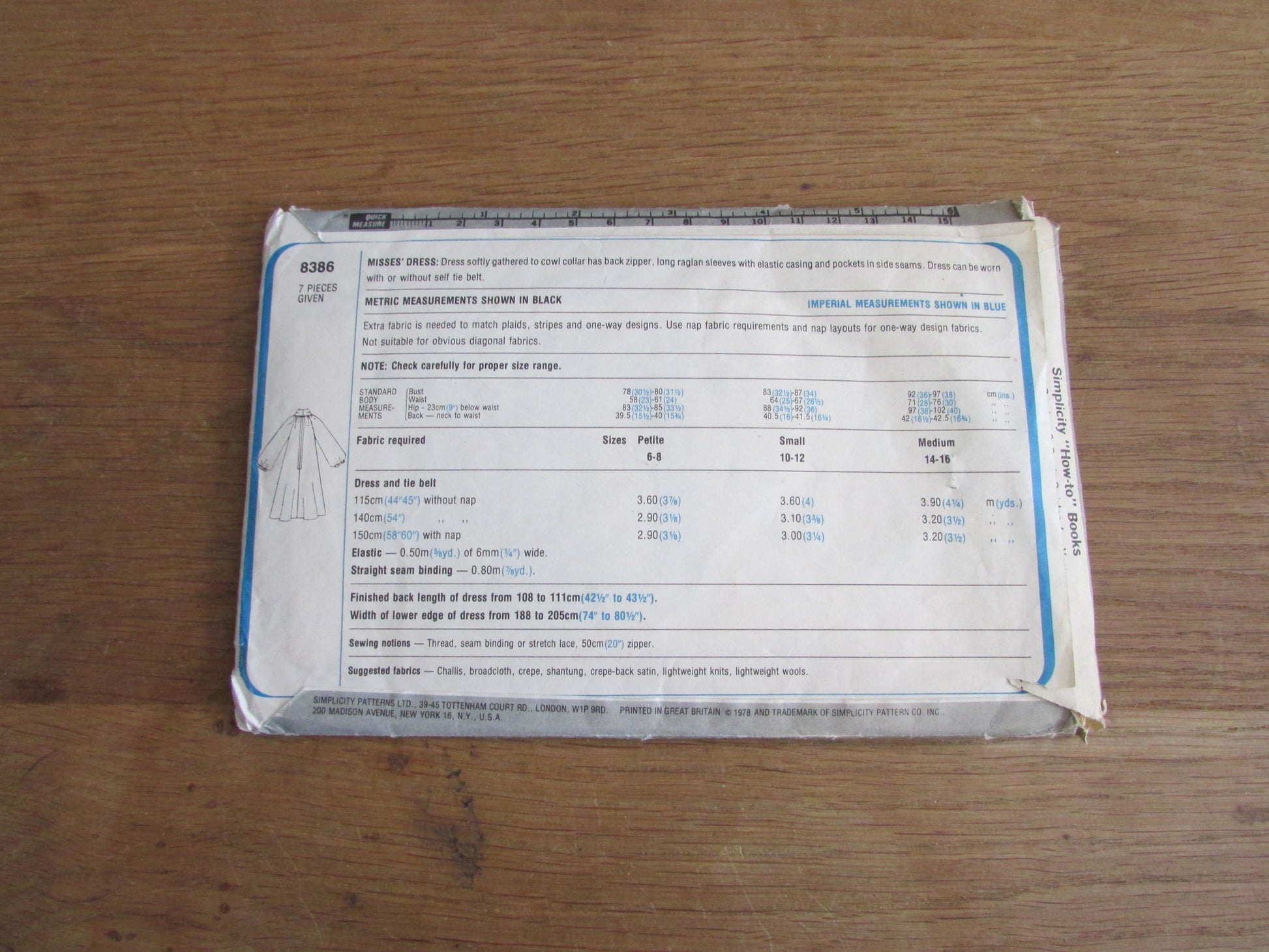 Used 1978 Simplicity 8386 sewing pattern for misses' cowl neck dress, size small 10-12 (see description below)