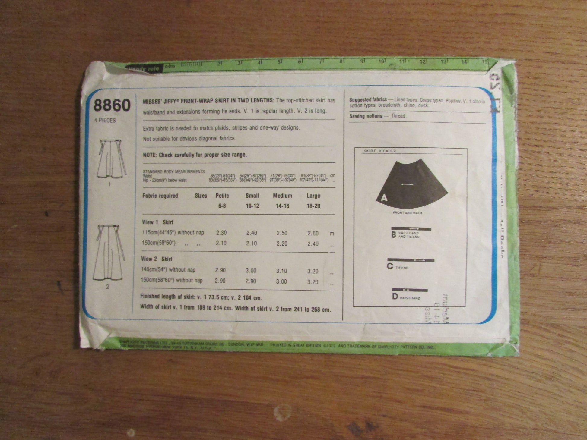 Used 1979 Simplicity 8860 sewing pattern for Jiffy misses' front-wrap skirt, size 14-16 (complete)