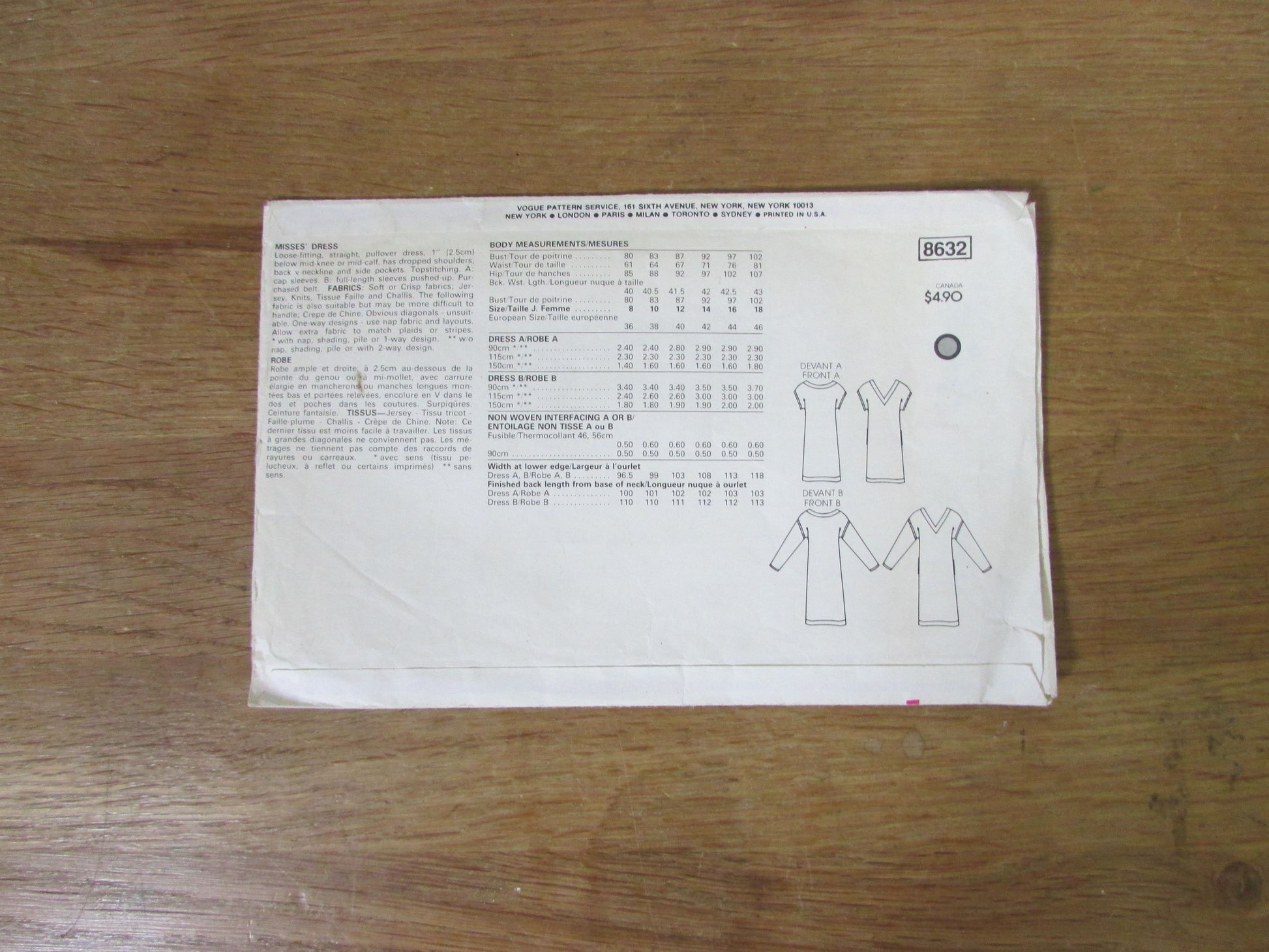 Used 1983 Vogue 8632 sewing pattern for misses' loose-fitting pullover dress, sizes 14-16-18 (cut to size 18, complete)