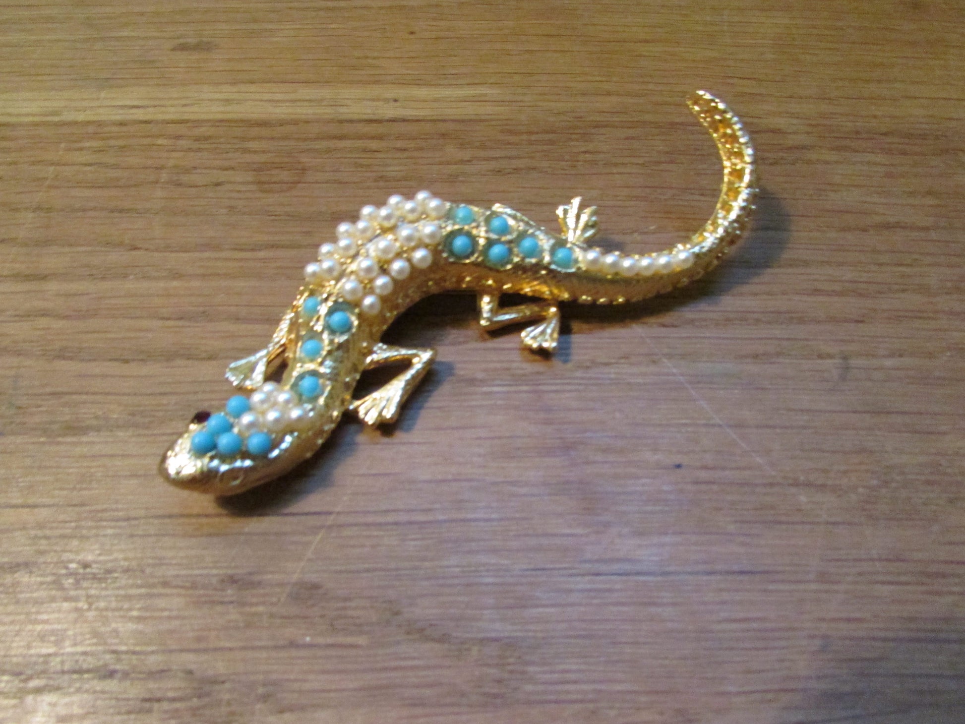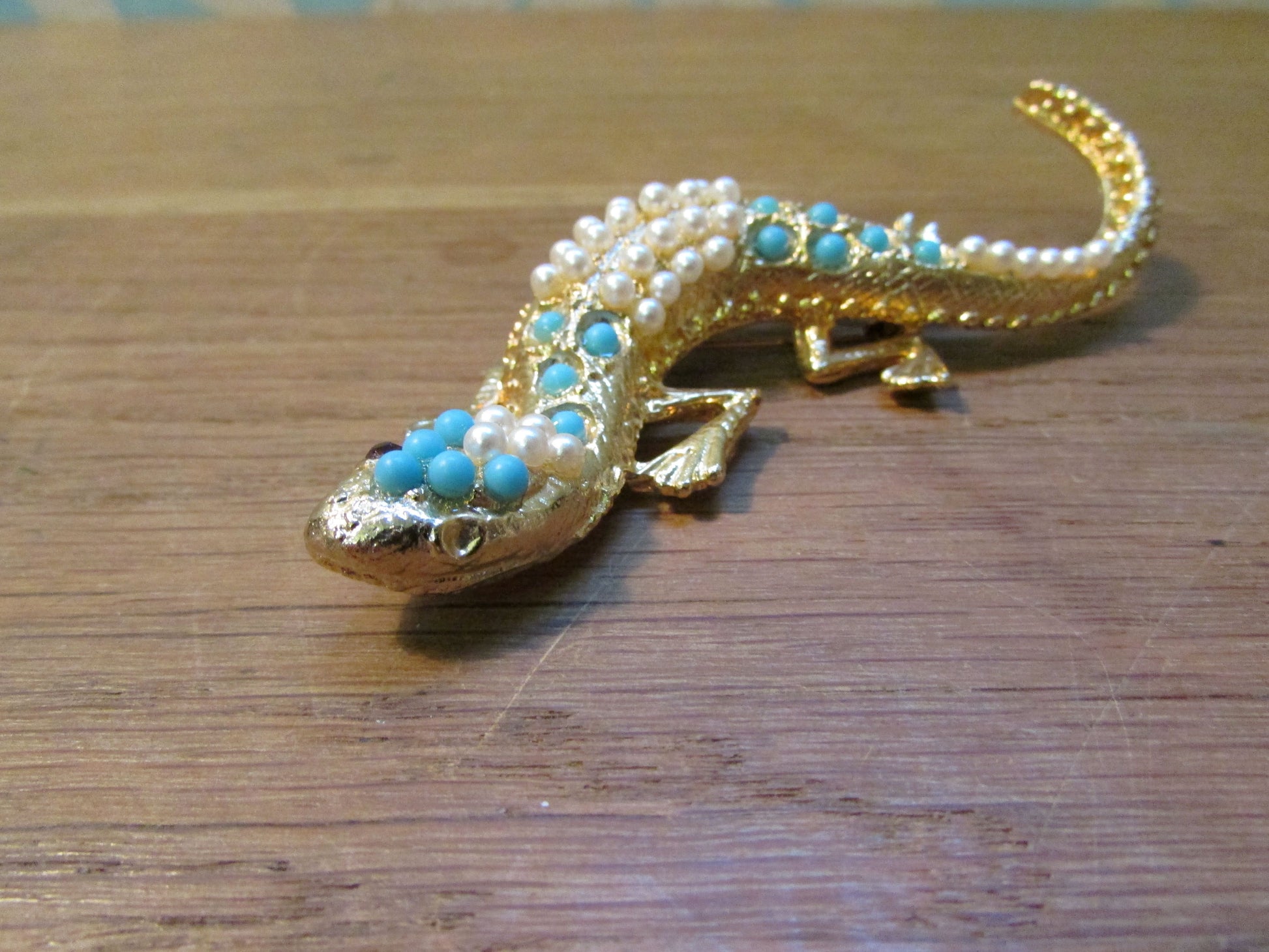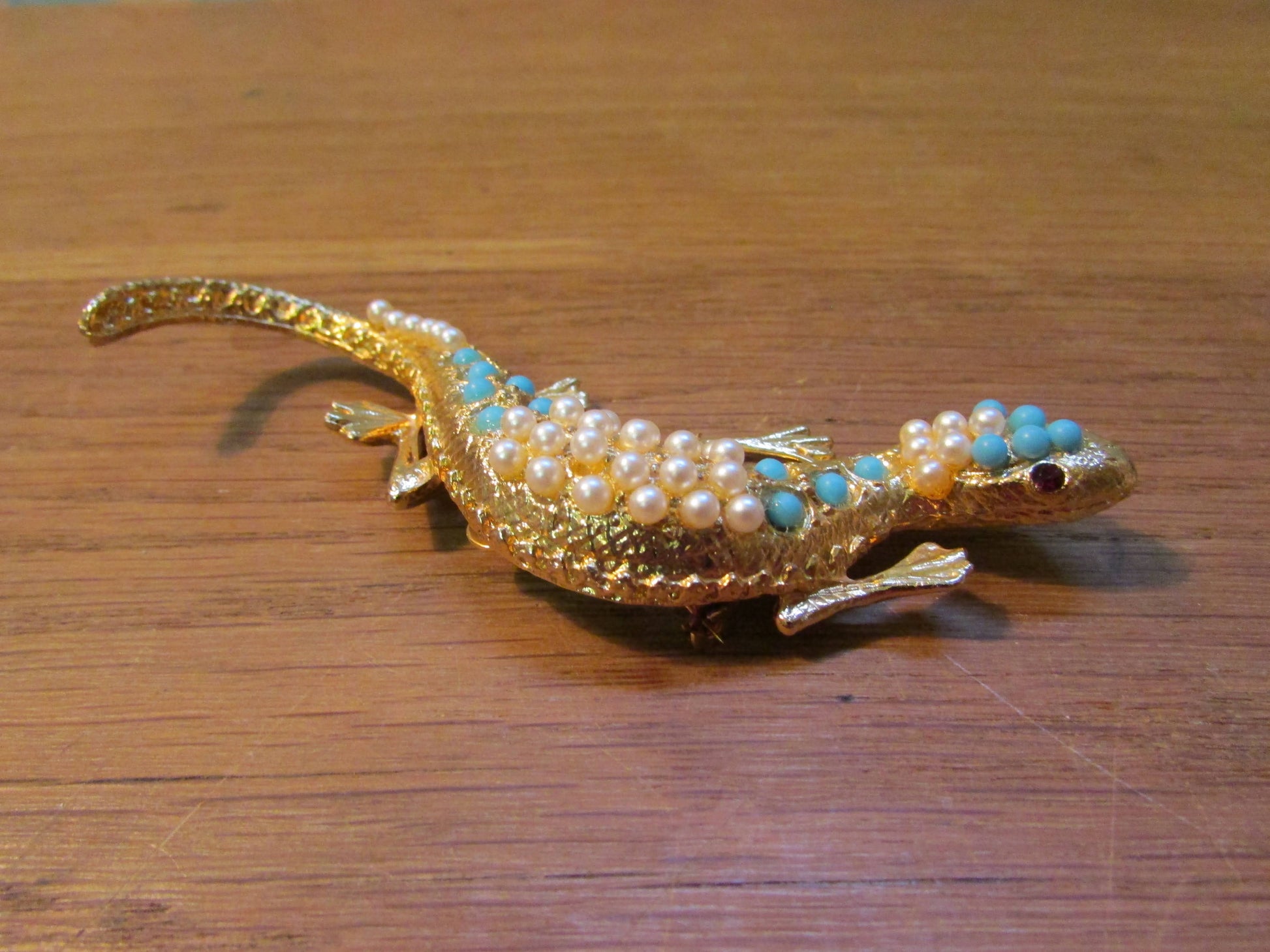 Vintage 1950s-style large gold-tone gecko/lizard brooch with faux pearl & turquoise bead detail