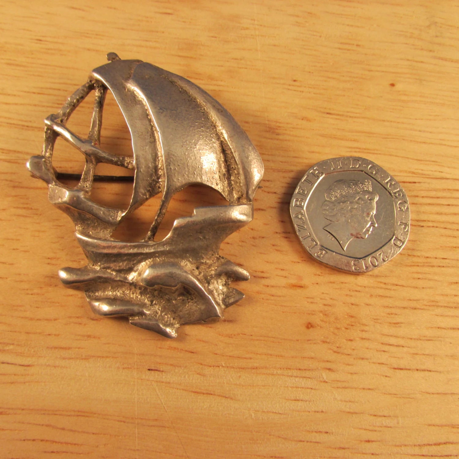 Vintage Arts & Crafts-style silver galleon brooch, stamped