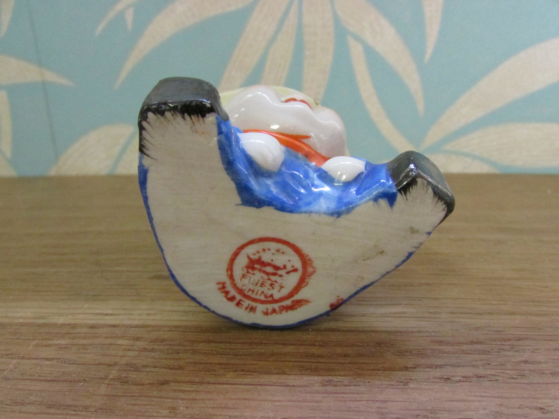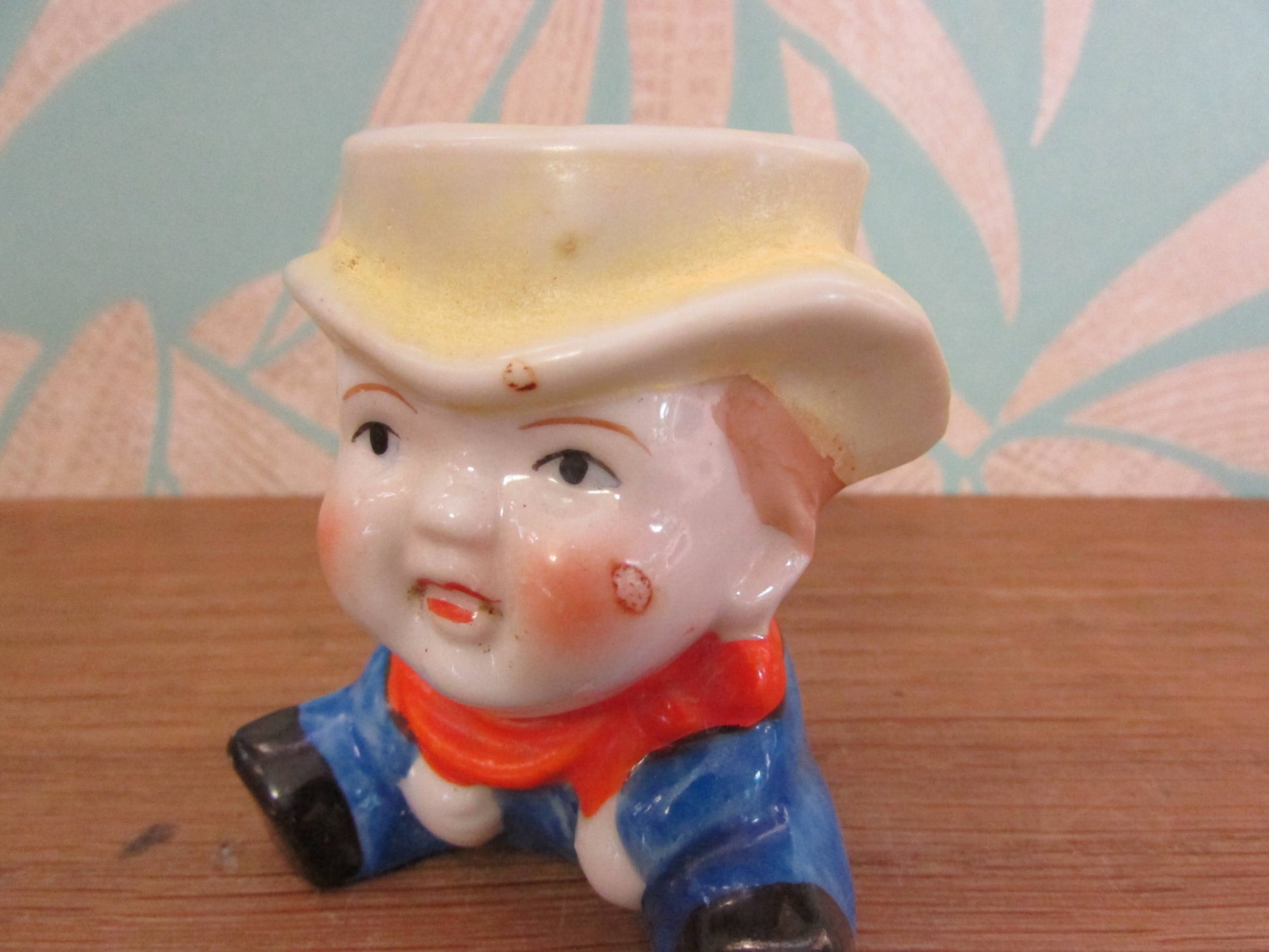 This delightful vintage ceramic egg cup from Japan showcases a boy donning a yellow hat. Standing about 6.5 cm tall, it blends collectible charm with everyday functionality, making it a unique and attractive piece for your kitchen or display collection.