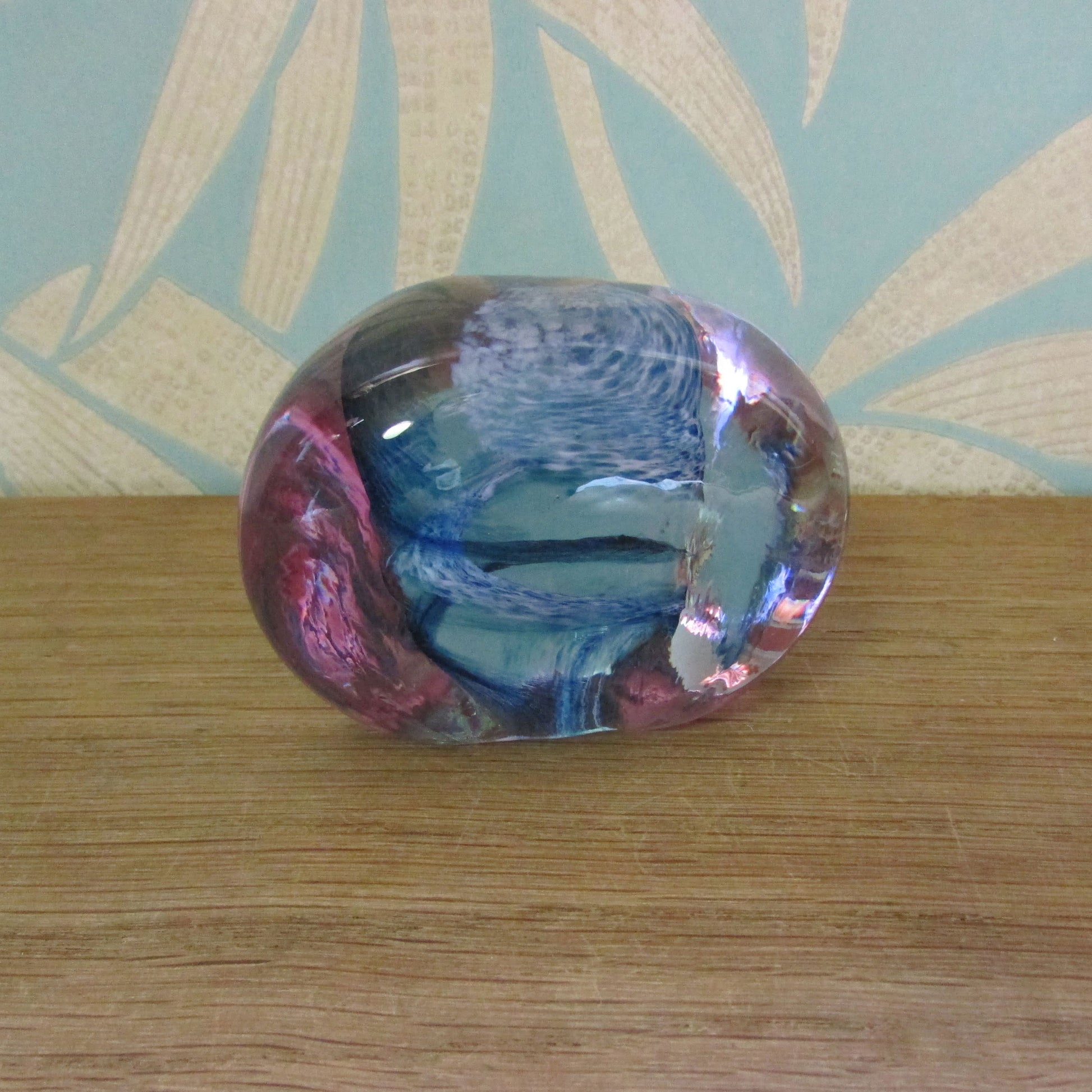 This vintage Caithness Glass paperweight features a captivating smoky blue swirl design, measuring approximately 8cm long, 6cm wide, and 6cm high. Its smooth pebble shape adds elegance to any desk or shelf while keeping your papers securely in place. A timeless collectible that blends artistic craftsmanship with practical use, perfect for adding a touch of sophistication to your space or gifting to a glass art enthusiast.