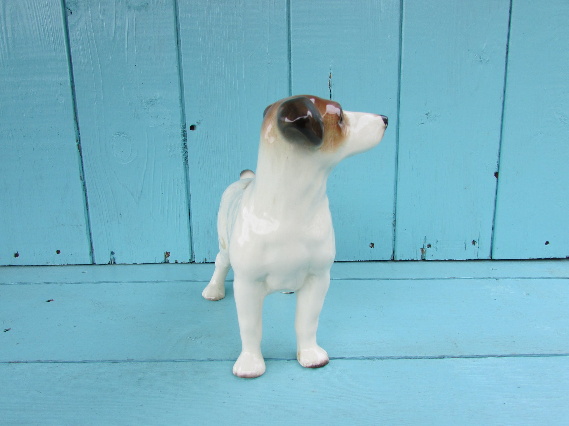 This charming Vintage Coopercraft ceramic Jack Russell, made in England, stands approximately 17cm tall. Its classic design and quality craftsmanship make it a perfect collectible or a distinctive addition to your home décor. Celebrate British pottery heritage while adding character to your space with this timeless figurine.