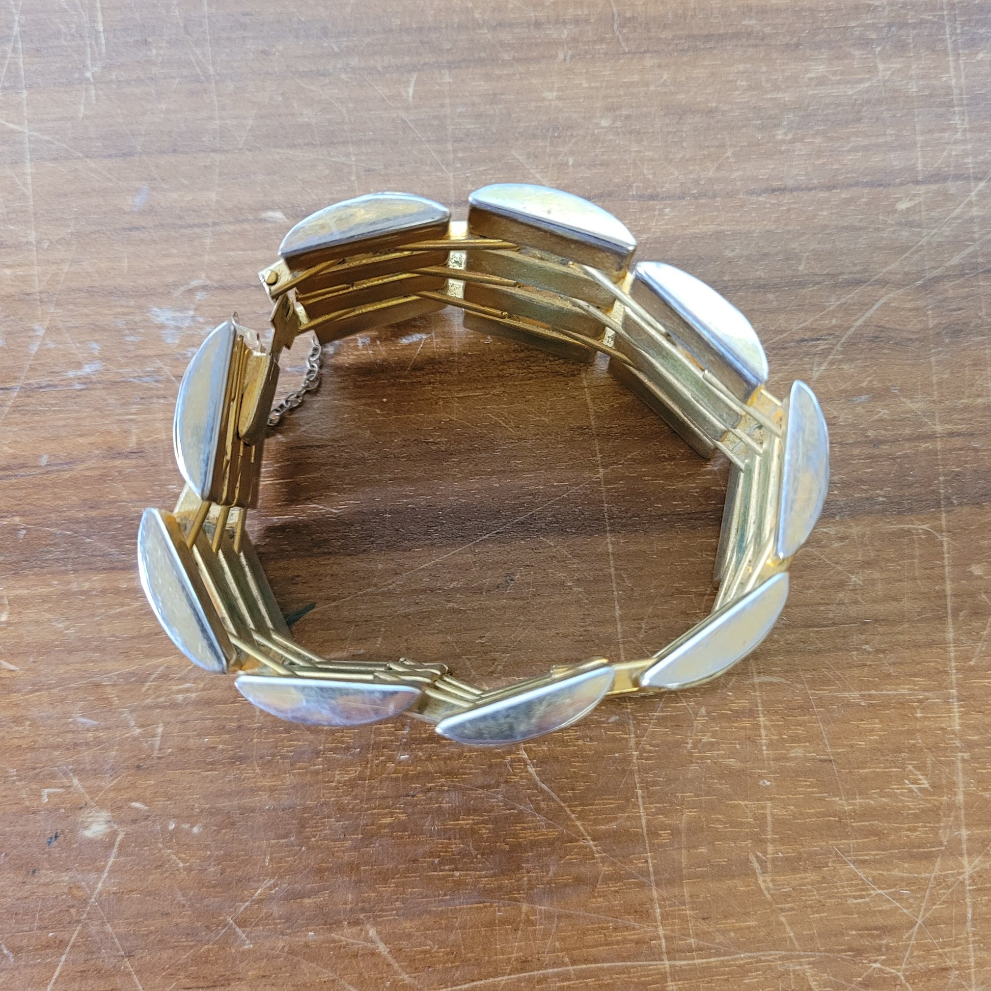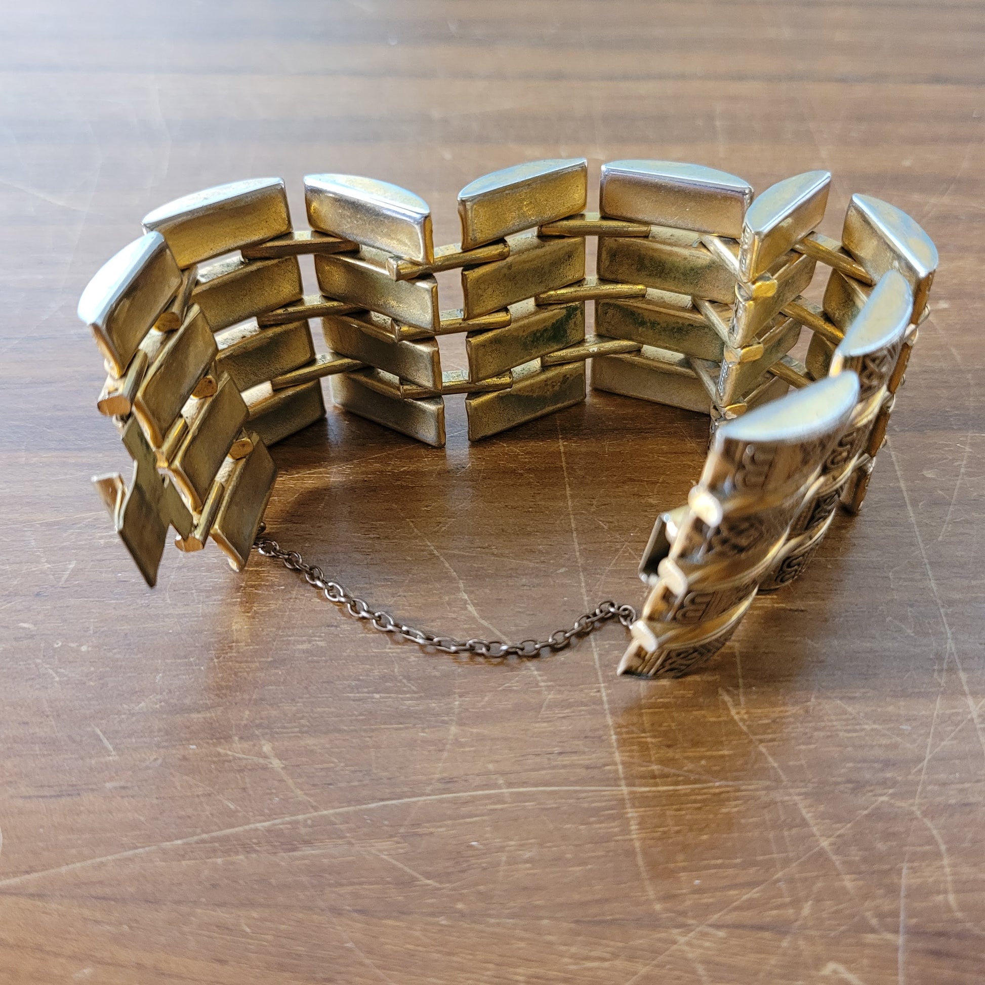Vintage Damascene gold-tone four row tank bracelet with safety chain.