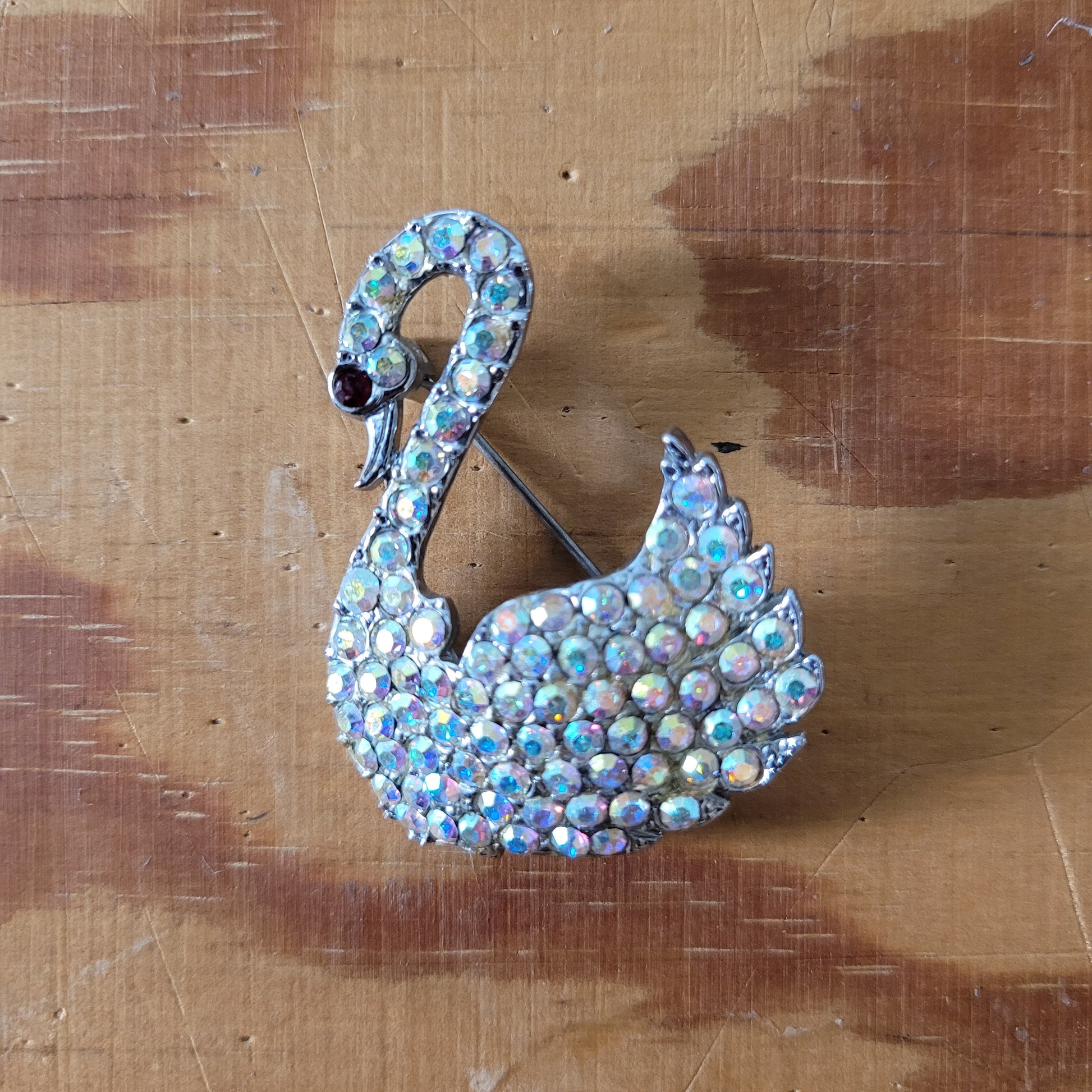 This vintage diamante swan brooch, measuring 4.5cm by 3.5cm, adds timeless elegance to any outfit. Its sparkling diamante detail catches the light beautifully, while the contrasting eye stone provides a striking focal point. Perfect for enhancing your appearance with a touch of classic charm and sophistication.