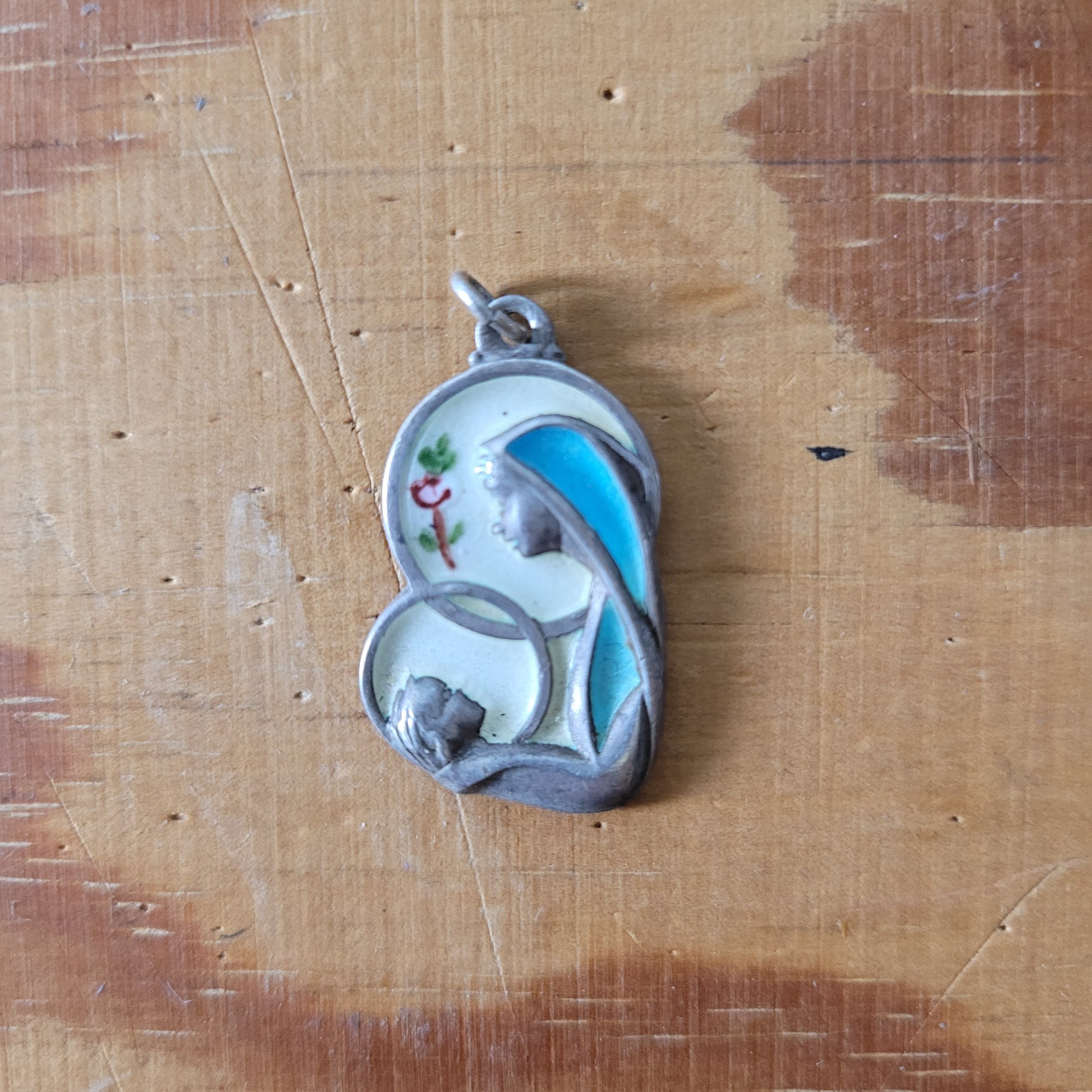 Vintage enamelled Mary & Jesus silver pendant, stamped Creed Sterling