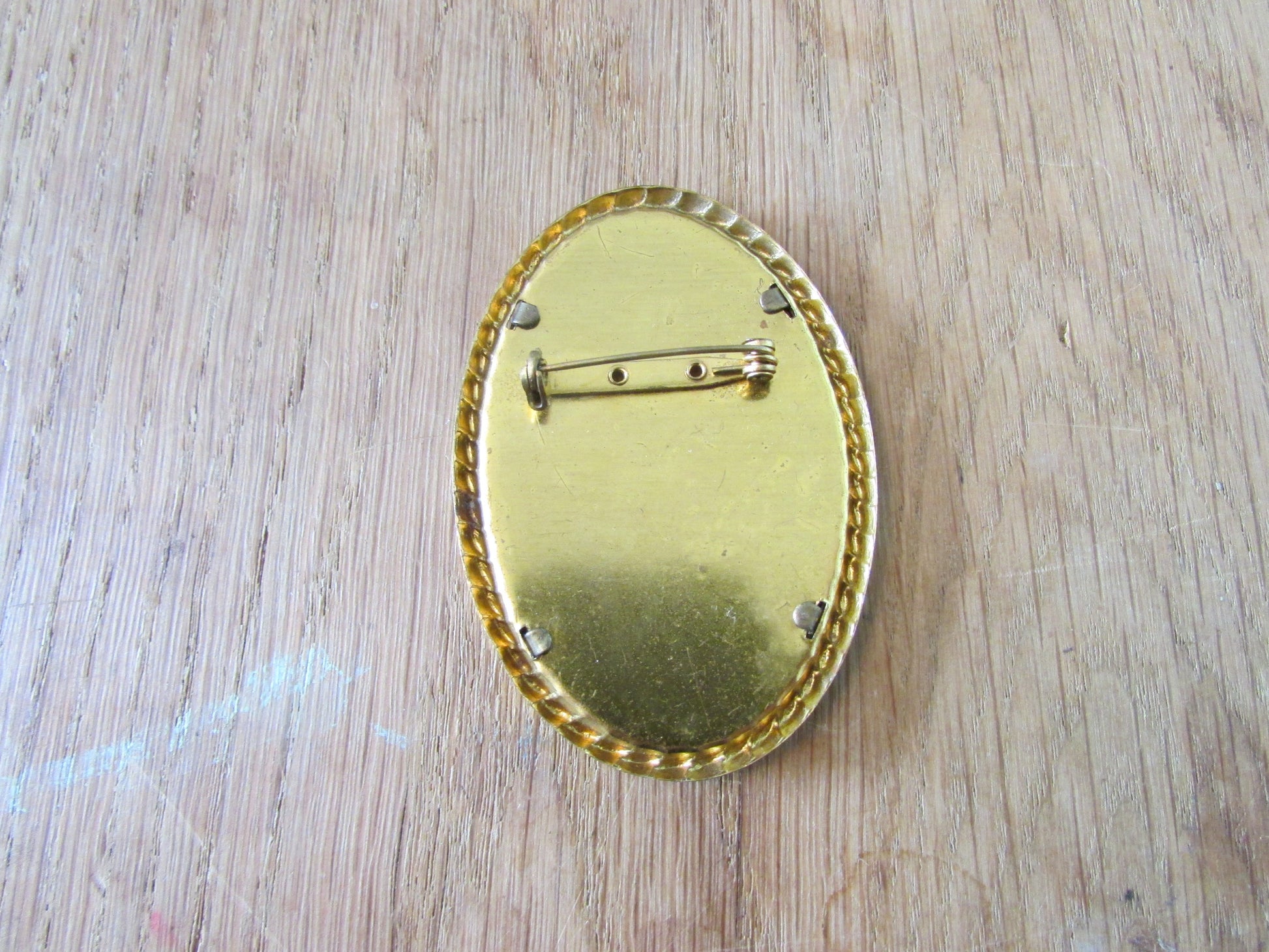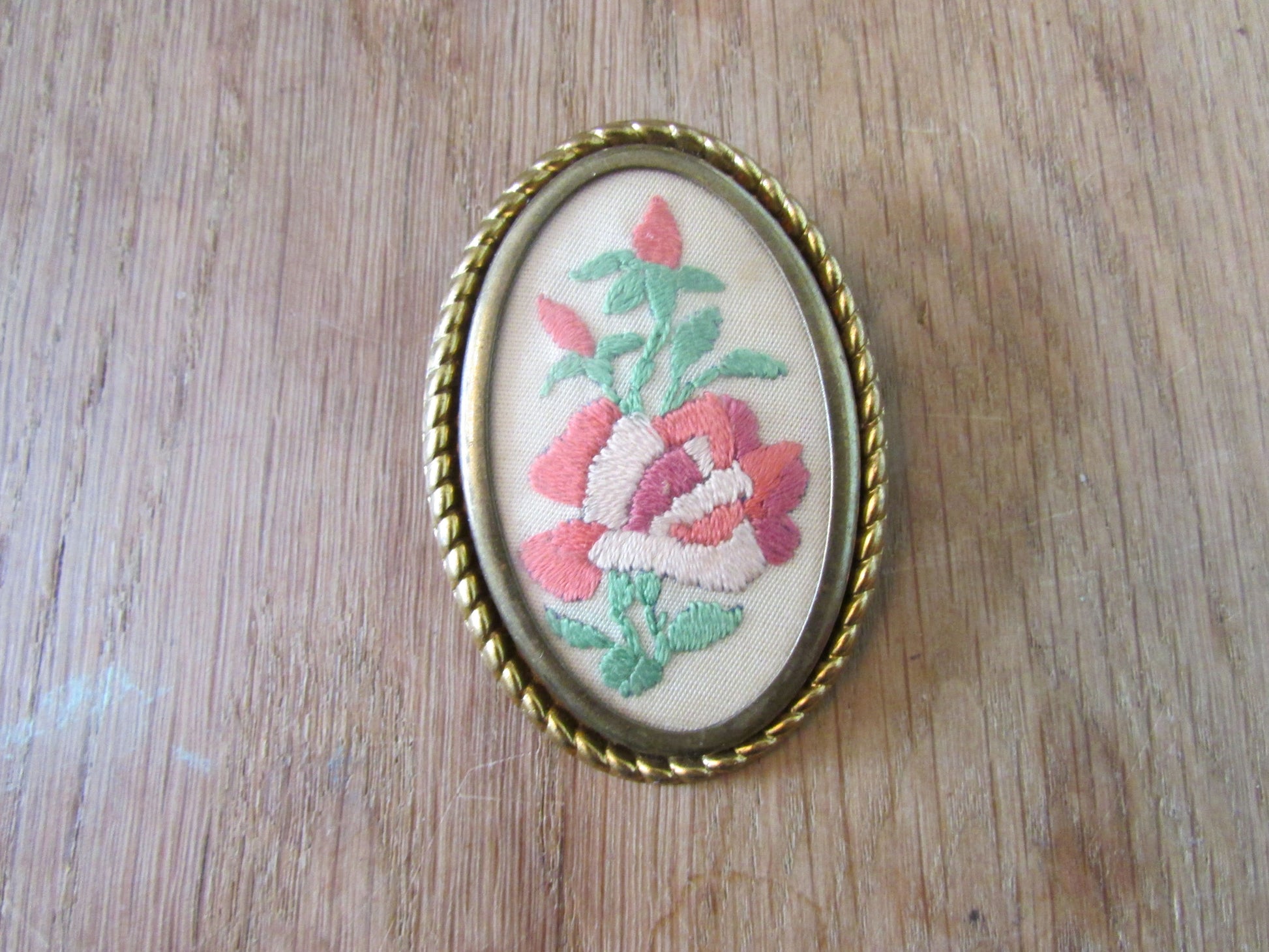 This vintage gold-tone brooch features a barley twist oval frame encasing delicate embroidered roses. Measuring 6.5cm by 4.5cm, it adds a timeless touch of elegance and charm to any outfit. Perfect for those who appreciate classic style with intricate detailing.