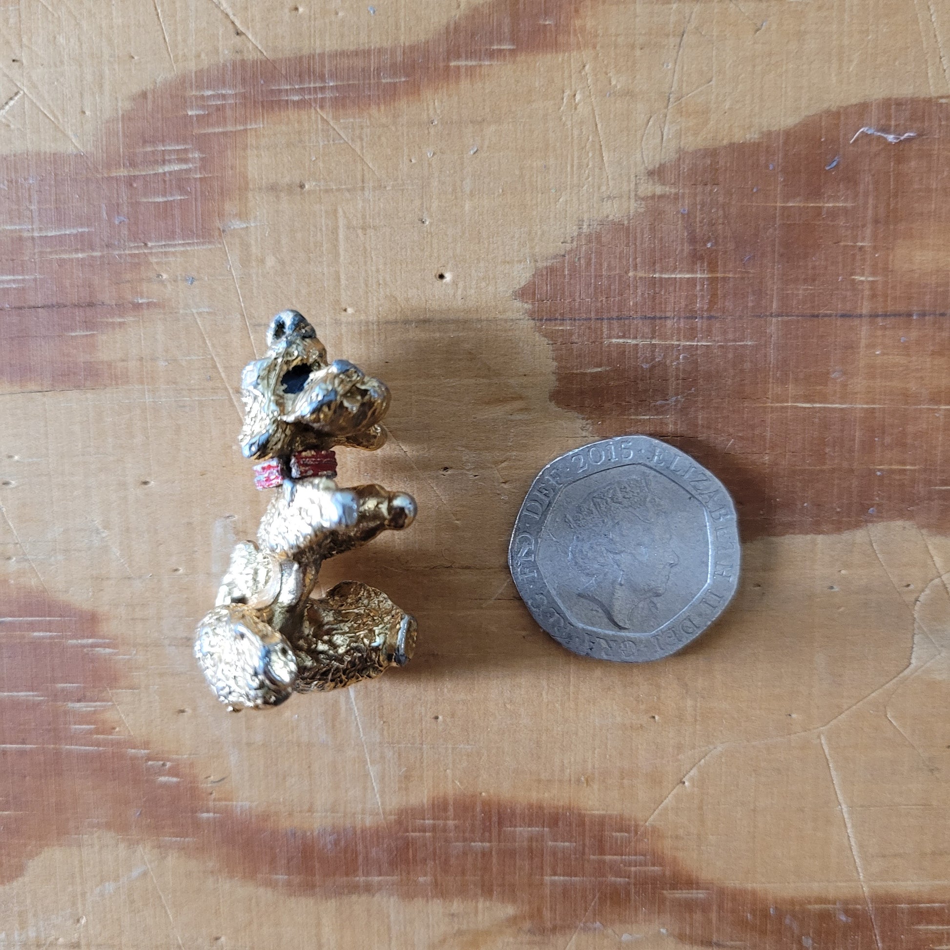 This charming vintage gold-tone French poodle pendant, measuring 3.5 cm, captures the playful elegance of a begging poodle adorned with a red collar. Its detailed craftsmanship makes it a standout accessory, perfect for adding a touch of classic whimsy to any outfit. Wear a piece that reflects timeless style and playful sophistication.