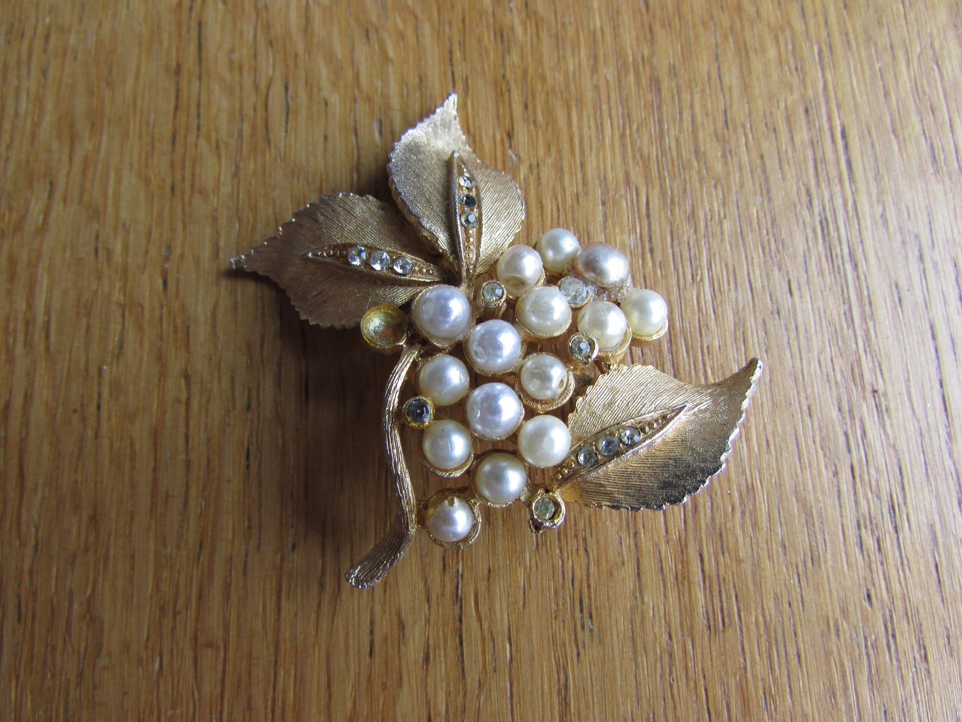 This vintage gold-tone leaf and faux pearl flower brooch adds a timeless touch to any outfit. Measuring approximately 5cm, its elegant design showcases delicate petals accented with lustrous faux pearls. A perfect accessory for those who appreciate classic style with a story. Please note, one pearl and a couple of the diamante are missing.