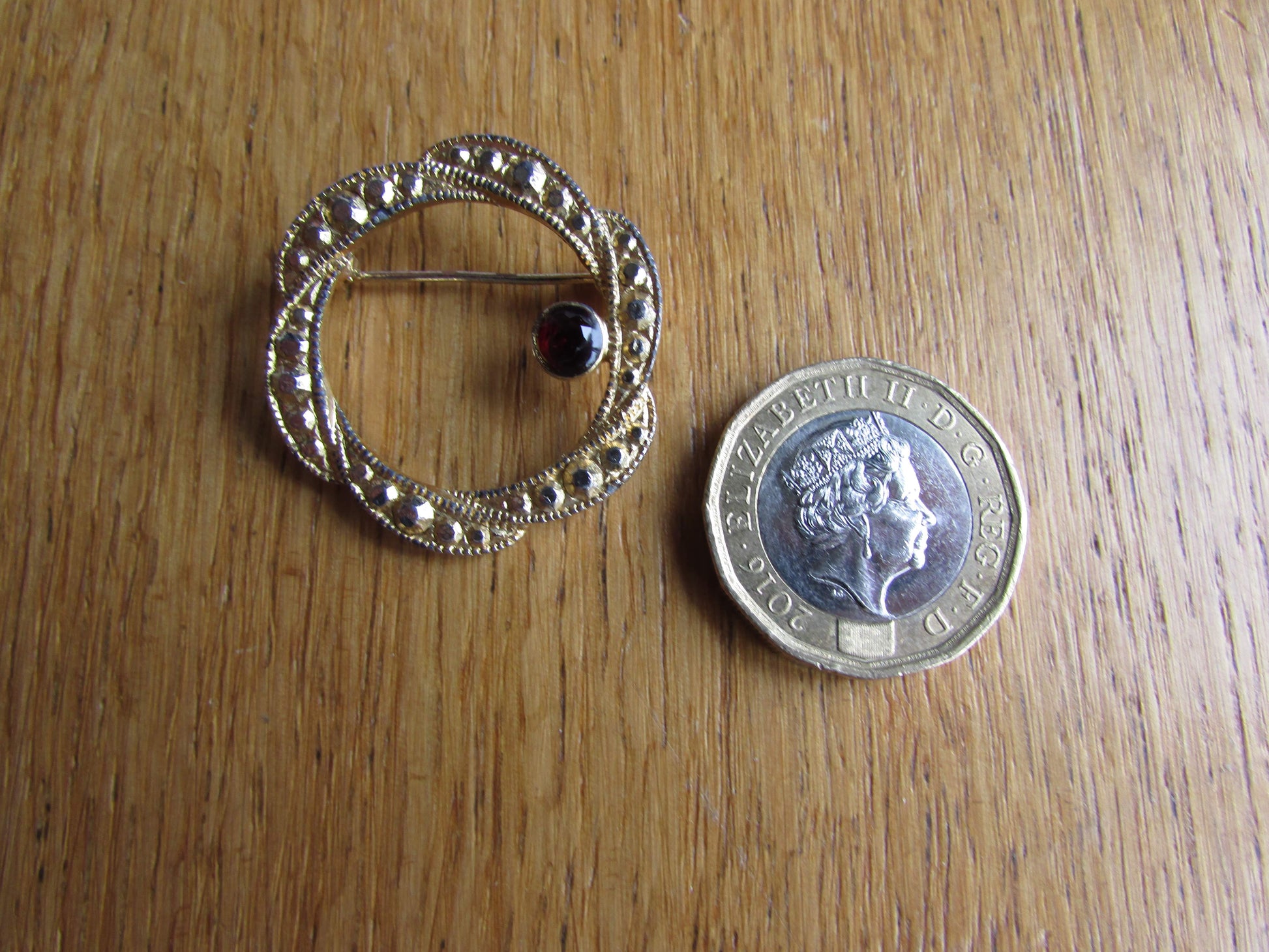 Vintage gold-tone ribbon swirl circlet brooch with garnet red diamanté detail