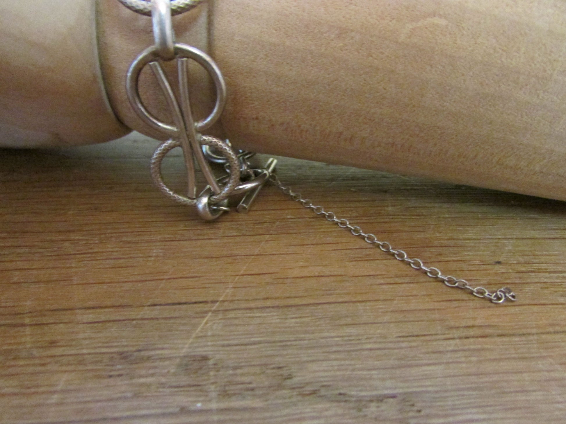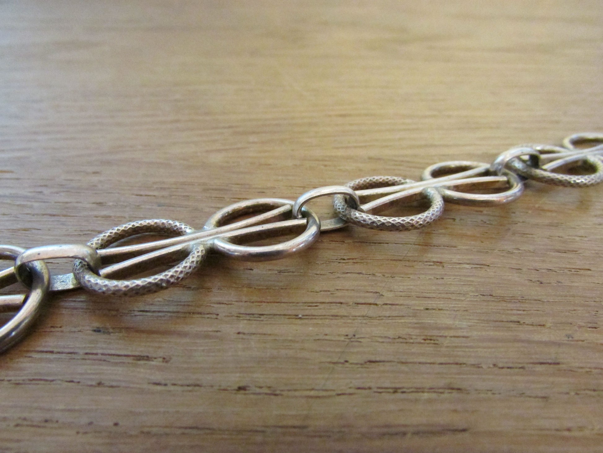 This vintage Italian silver-tone bracelet features elegantly crafted paired link circles, adding timeless charm to any outfit. Measuring 18 cm, it offers a comfortable fit while showcasing classic design. Stamped with "61 AR 800," this bracelet promises authentic quality and vintage appeal—perfect for collectors or those seeking a unique accessory with history. Please note the safety chain requires repair.