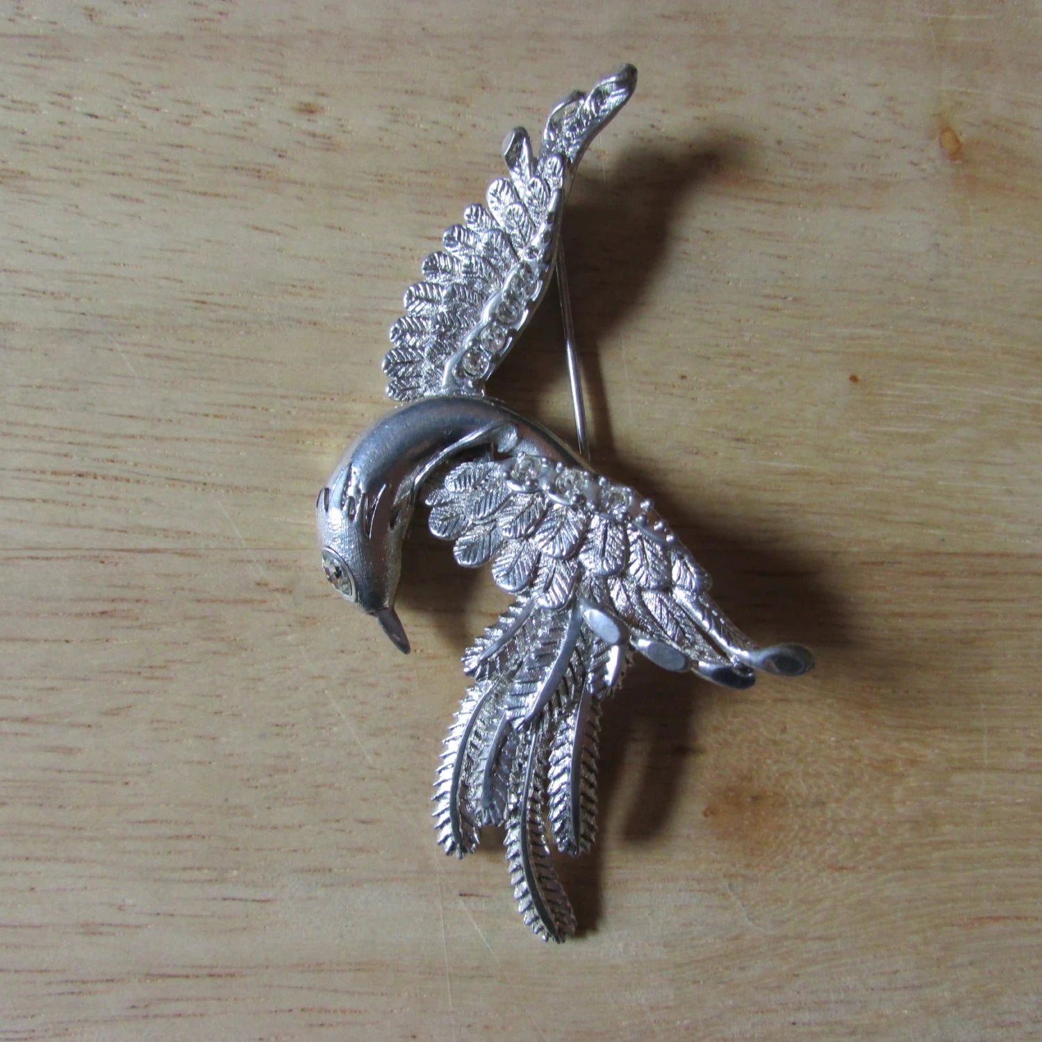 Vintage large silver-tone bird in flight brooch with textured feather detail & diamanté eye