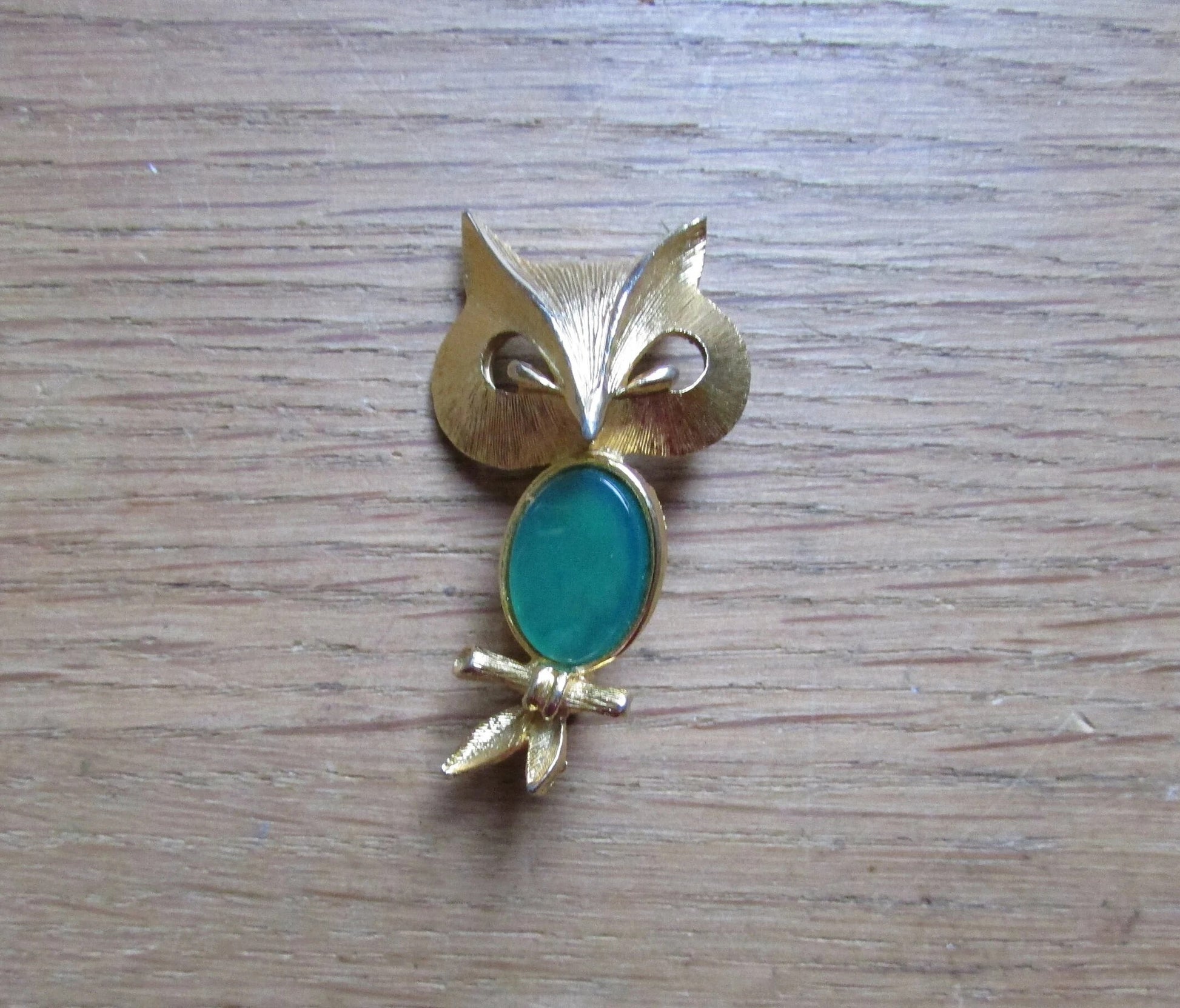 Vintage Liz Clairborne modernist-style gold-tone owl brooch with green cabochon belly