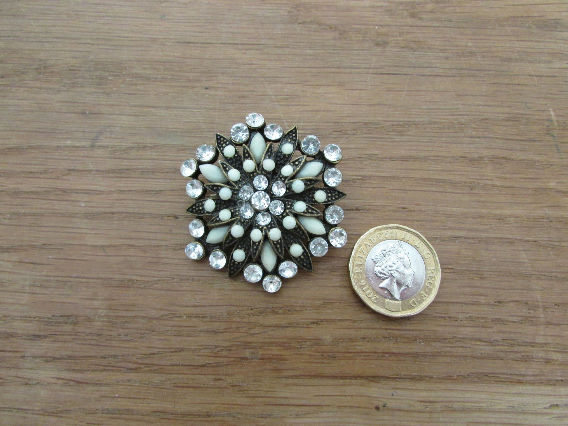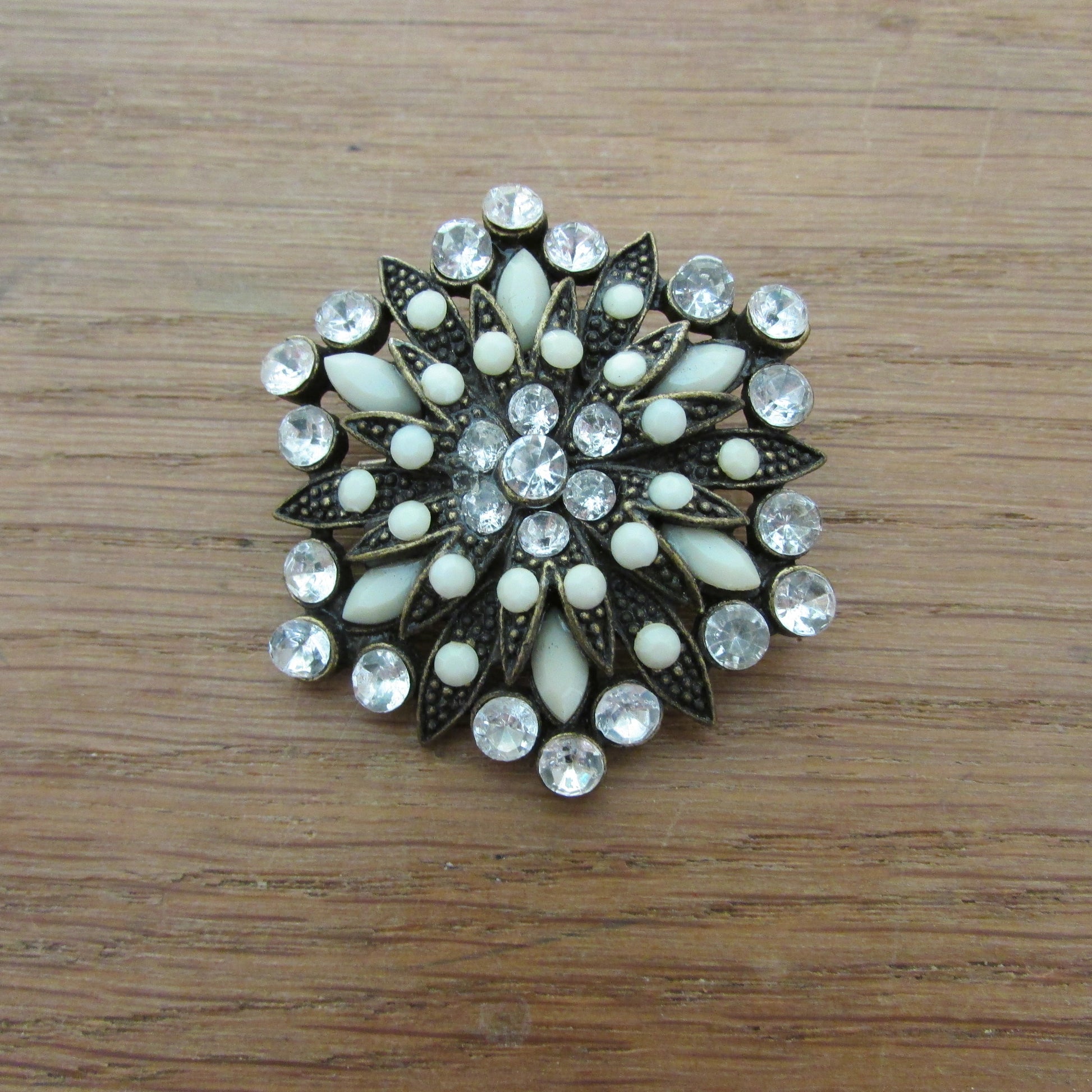 This vintage milk glass and rhinestone circle brooch, approximately 4 cm in diameter has had its brooch back replaced to ensure secure wearing. Its classic design adds timeless elegance, making it a perfect accessory to elevate any outfit with a touch of vintage charm.